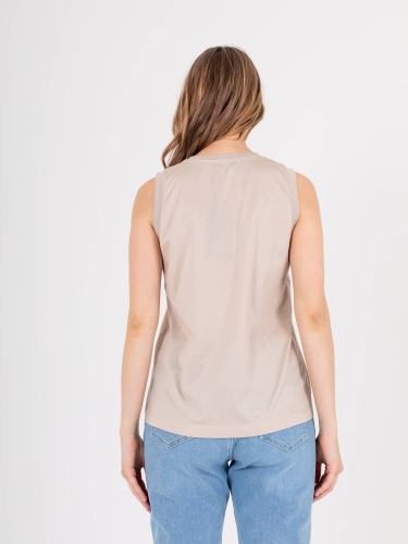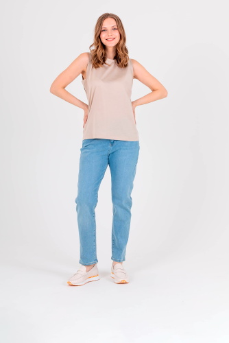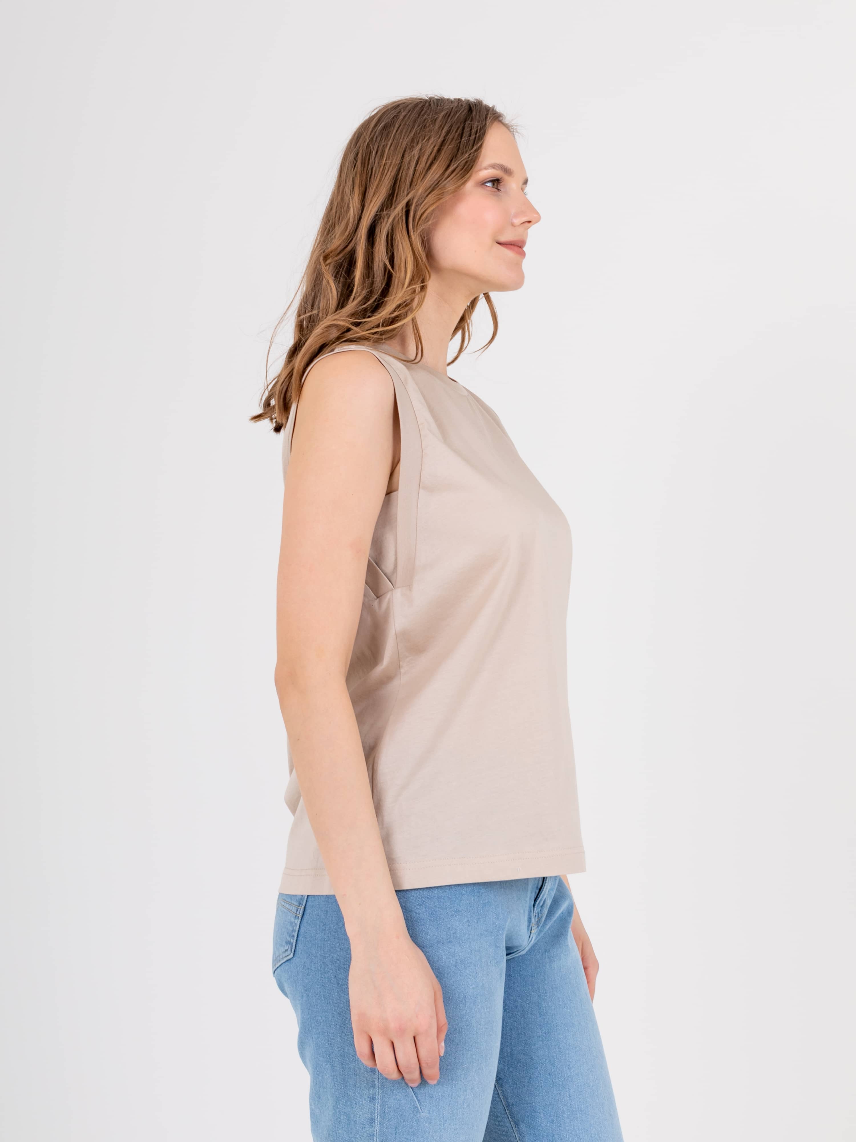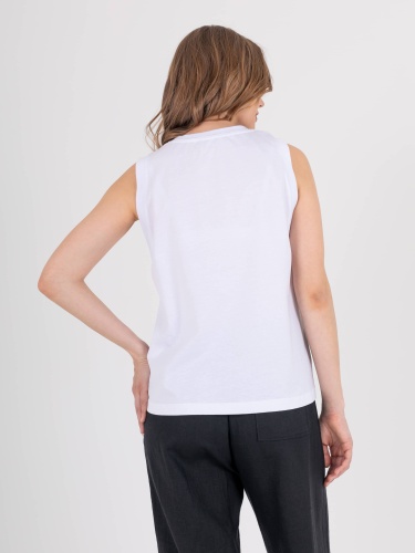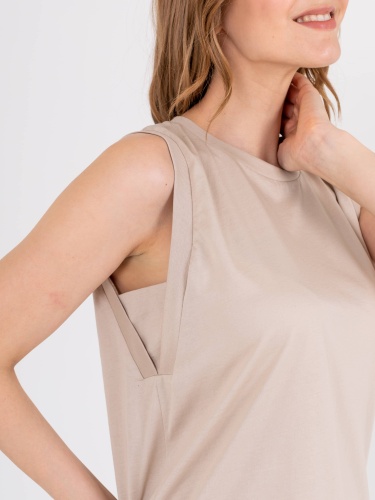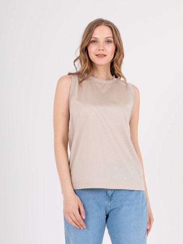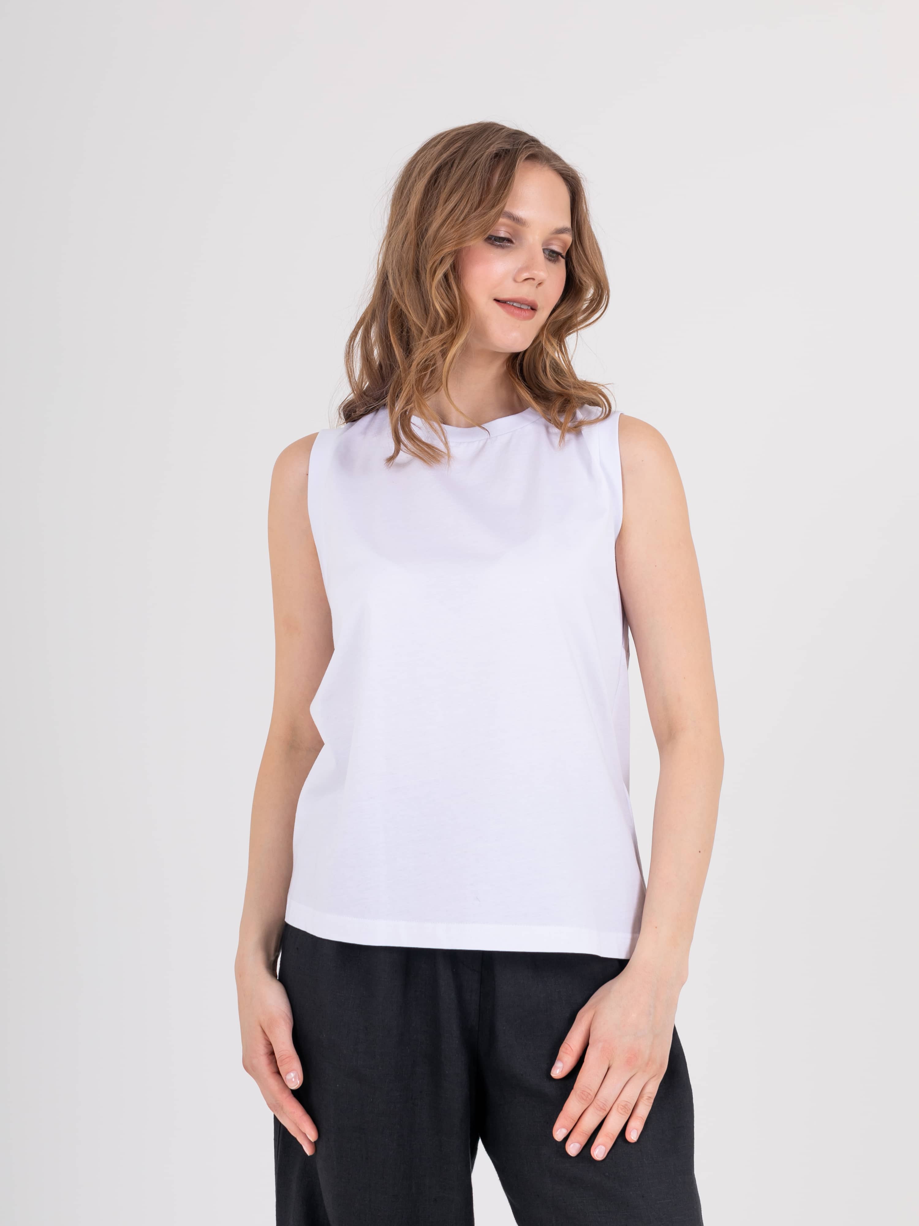 Нежный топ средней длины прямого силуэта из легкого 100% хлопка, с углубленной проймой и вставками. Круглый вырез горловины.