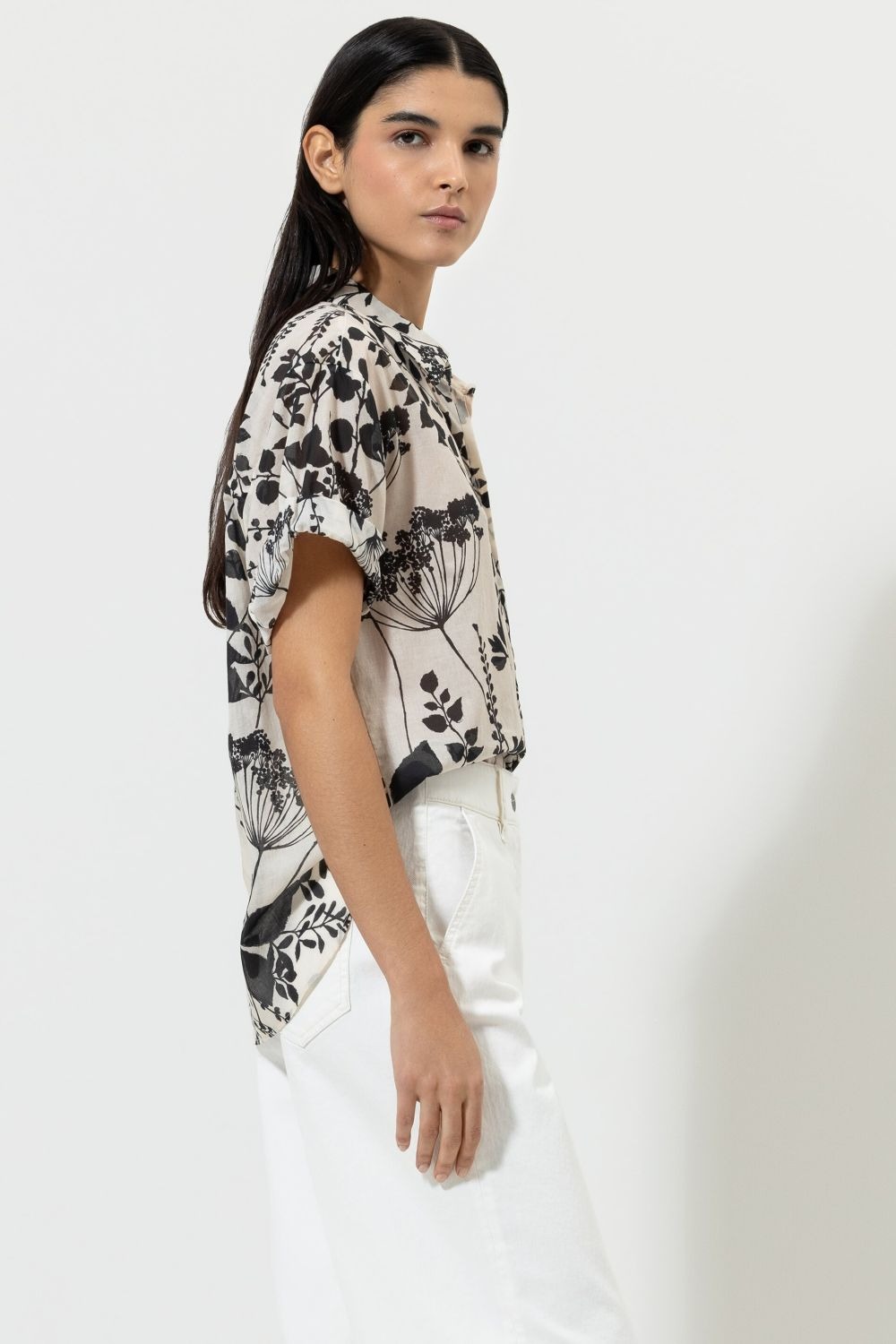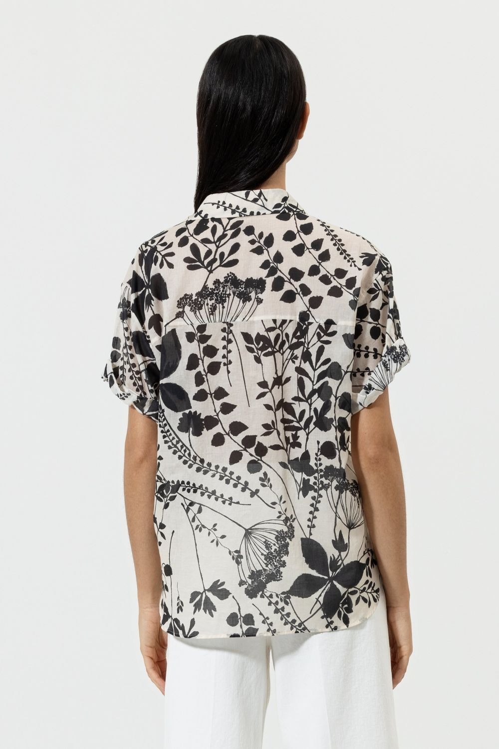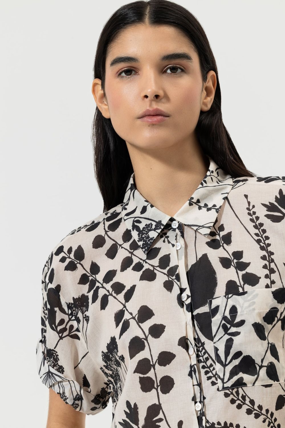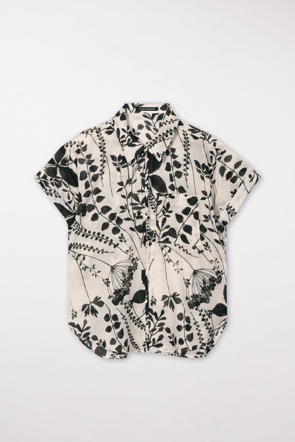 Рубашка повседневного кроя из легкой хлопковой вуали с эксклюзивным графическим абстрактным рисунком в виде цветов и травы и планкой на пуговицах во всю длину. Короткие рукава имеют фиксированный отворот, а подол закруглен.