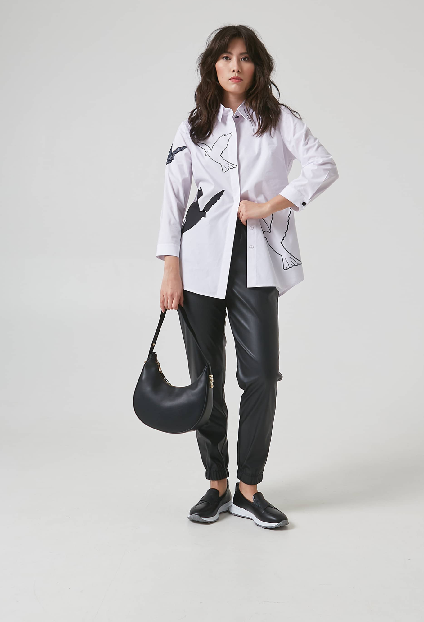 Удлиненная рубашка прямого силуэта с разрезами в боковых швах, дизайнерская особенность модели - графичный принт. Перед с двумя вытачками на выпуклость груди, идущими из боковых швов. Застежка потайная на 10 пуговиц. Длинные втачные рукава с манжетами, прорезными петлями и пуговицами. Стояче-отложной воротник.