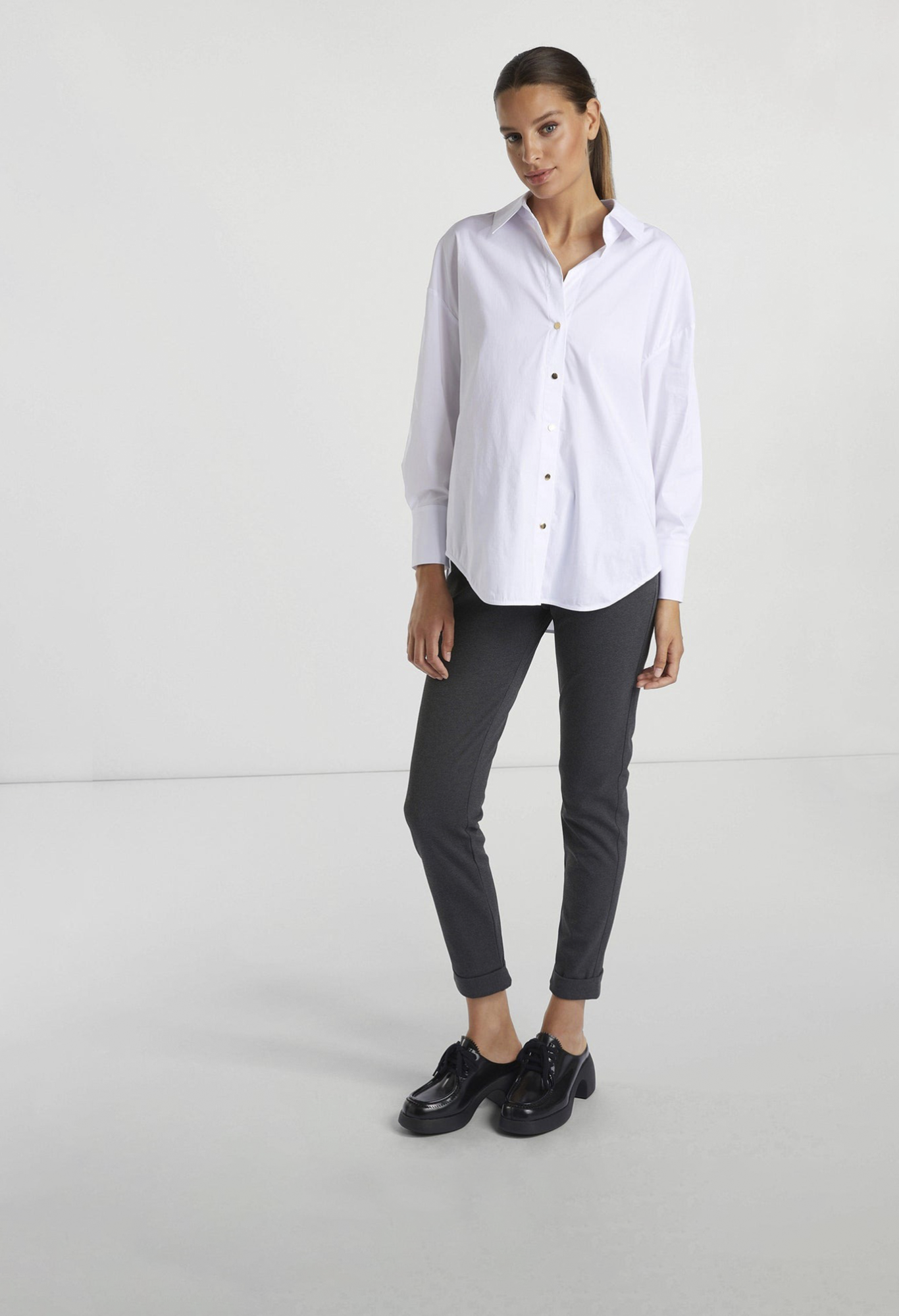 Удлиненная спина и широкий силуэт придают этой классической блузке-рубашке особую изюминку. Она также впечатляет приятным сочетанием хлопка и эластана. Застегивается на блестящие металлические кнопки