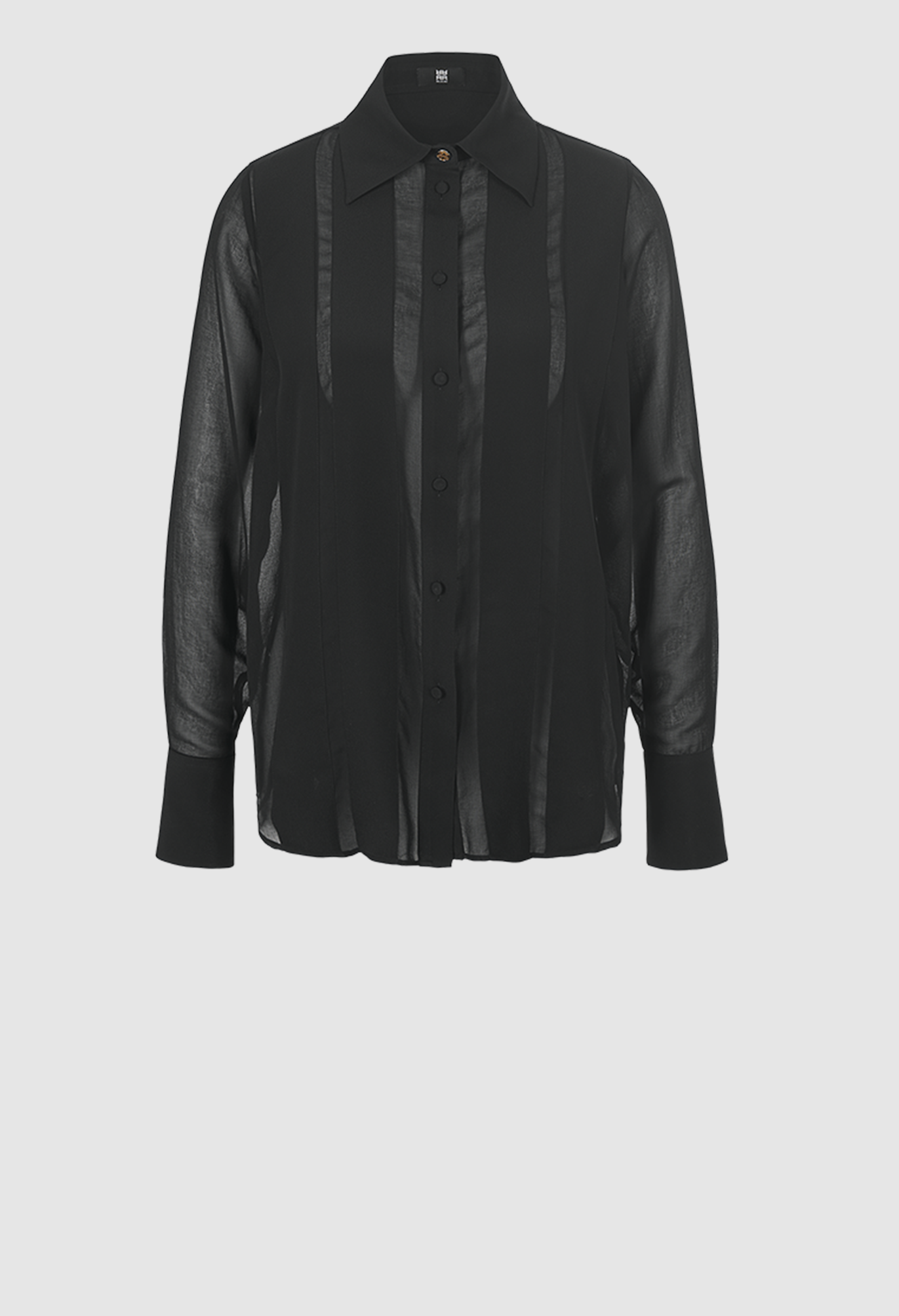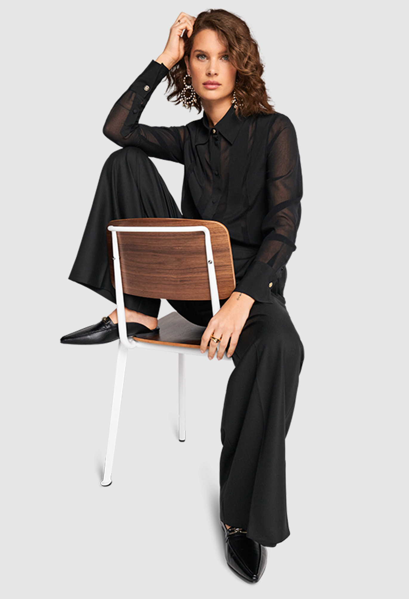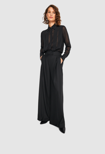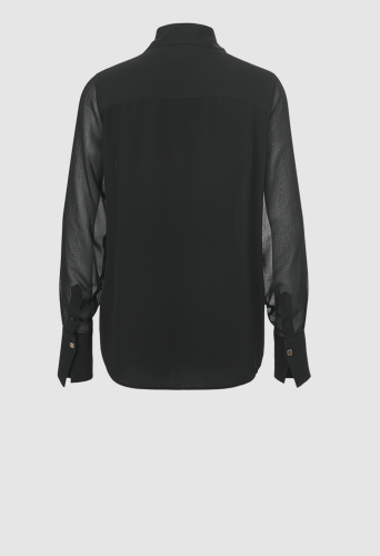 Блузка выделяется своим изящным узором из полупрозрачной и непрозрачной ткани и классическим лаконичным стилем. Эффект потрясающий и выглядит очень шикарно. В качестве материала мы выбрали легкий, не мнеющийся шелковистый креп, который идеально подходит для этого образа.