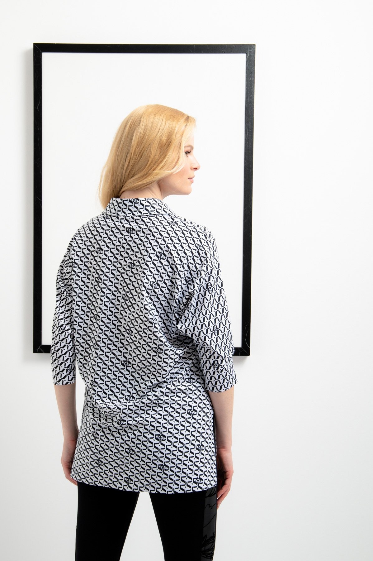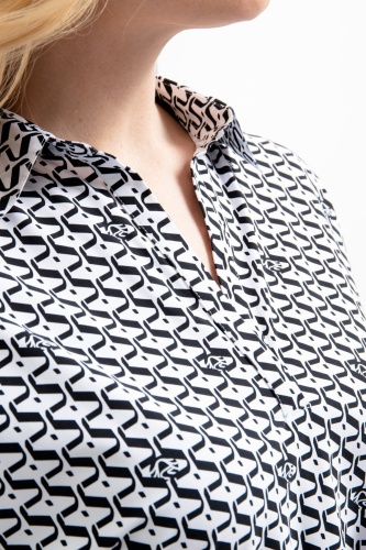 Блузка без шнуровки изготовлена из тонкого технического трикотажа с графическим принтом по всей поверхности и интегрированными логотипами Sportalm. Свободный силуэт завершают отрезные рукава 3/4. Классический воротник рубашки заканчивается небольшим разрезом посередине спереди. Края подола, края рукавов и воротника открыты, что создает эффект поношенности. В боковом шве разрезы, спинка удлинена. Длина спины размера 42 - 76,5 см.