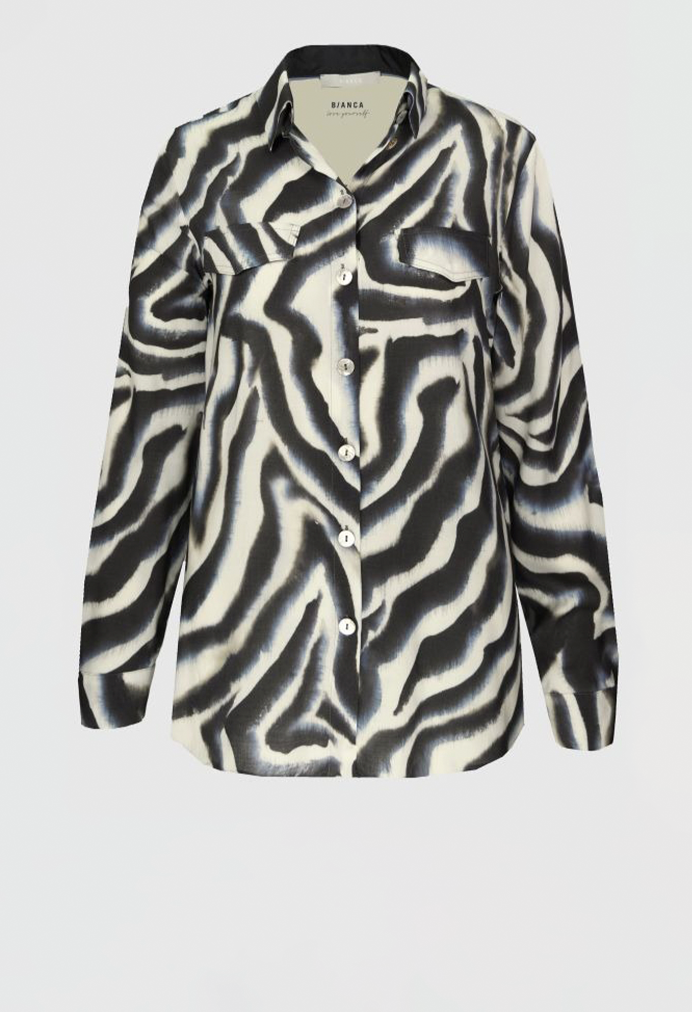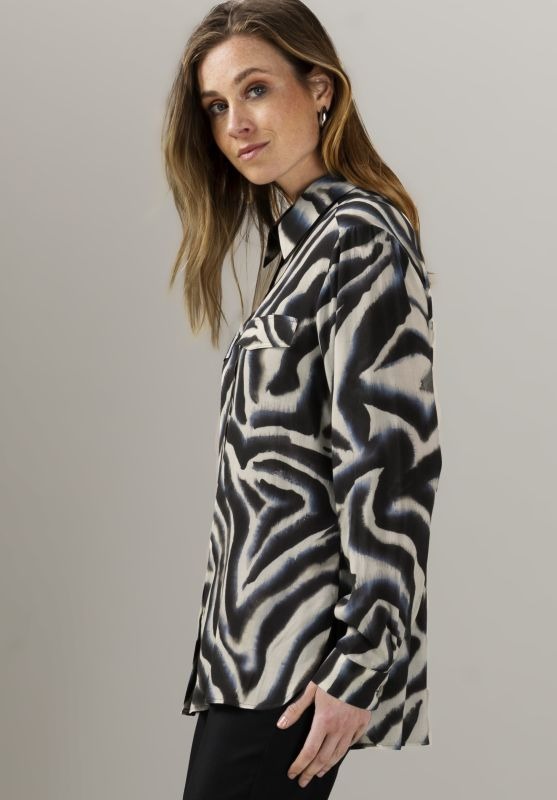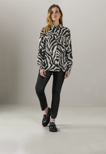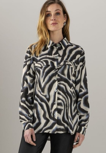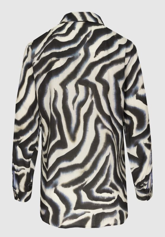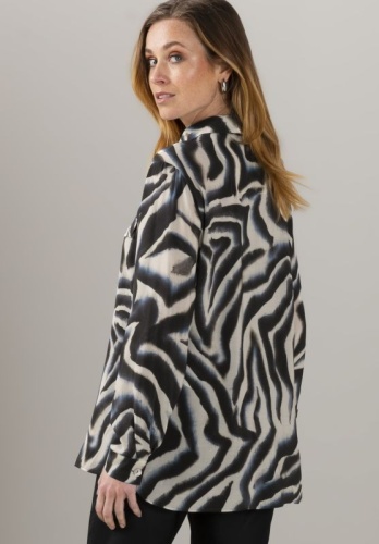 Классная блузка с принтом и сплошным дизайном в модных цветах. 100% вискоза для комфортной посадки. С планкой на пуговицах, клапанами и длинными рукавами. Удлиненный свободный крой с боковыми разрезами на подоле. Длина около 72 см.