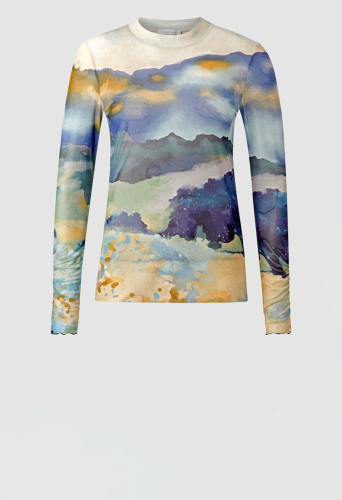 Слегка прозрачный лонгслив из переработанной сетки с размытым пейзажным принтом в акварельном стиле. Облегающий фигуру силуэт с слегка оборками по краю. Длина для размера 42: 64 см. Окружность груди для размера 42: 82 см.