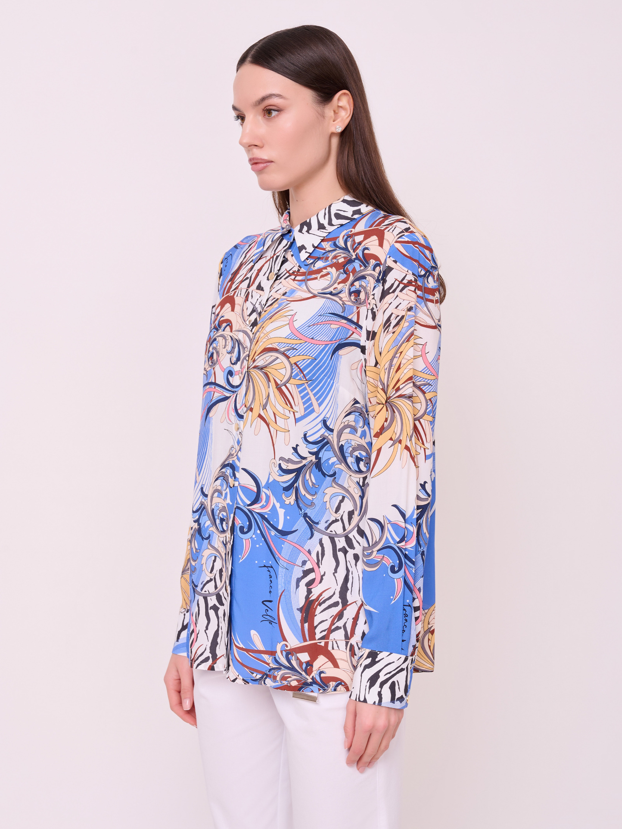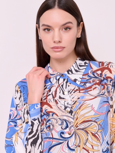 Вискозный текстиль, застежка пуговицы, вырез горловины отложной воротничок, рукава длинные с манжетами на пуговицах, покрой рубашечный, рисунок цветы и растения.