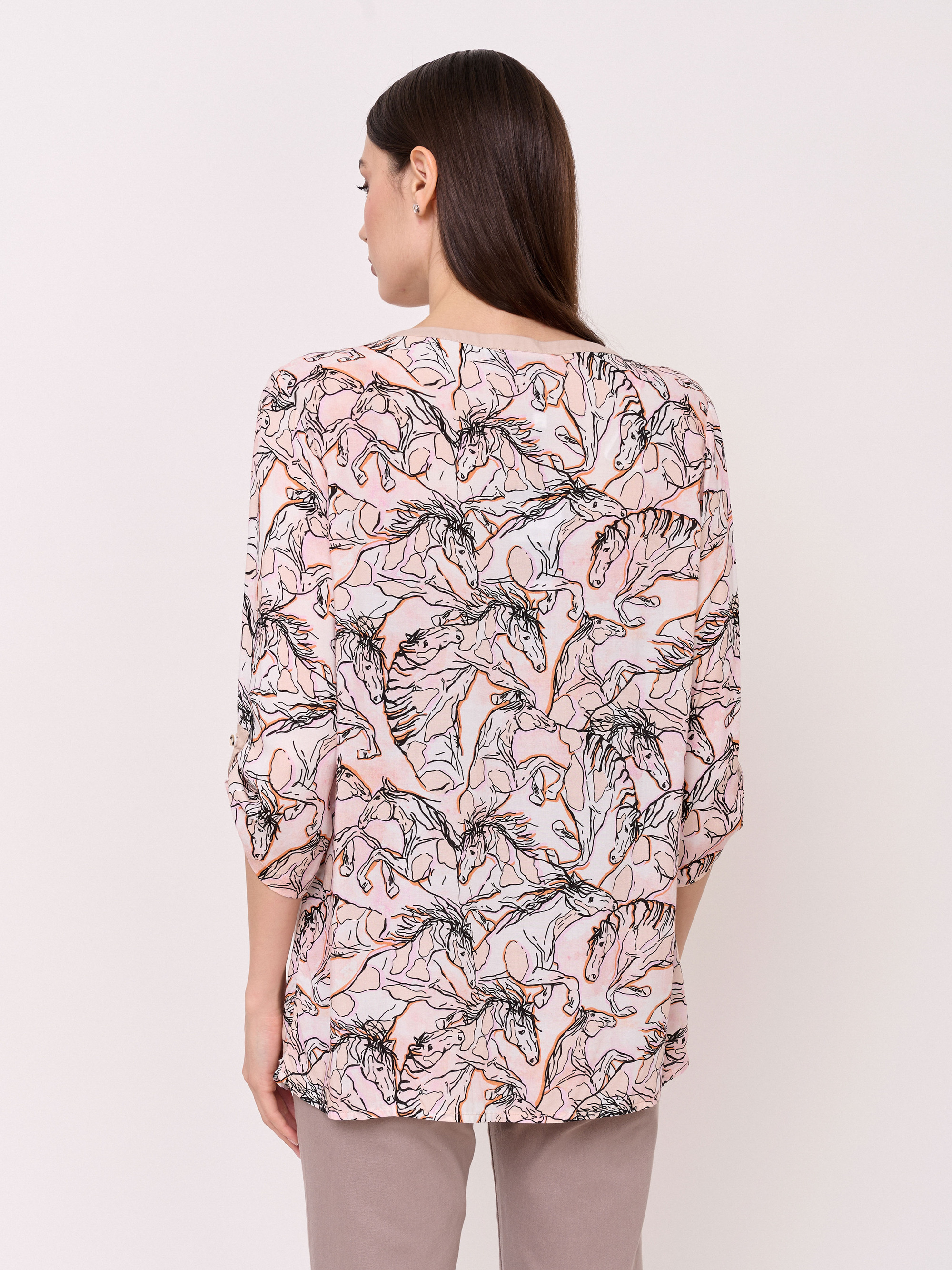 Детали: застежка пуговицы, вырез горловины v-образный, рукава 3/4 с хлястиками на пуговице, покрой прямой, рисунок анималистический, стразы. Длина по спинке: 68 см.