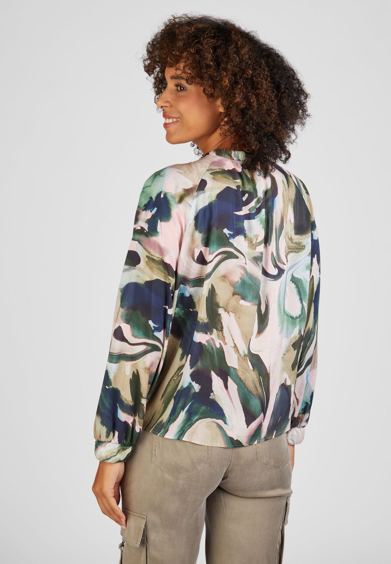 Блузка с длинными рукавами и шикарным воротником-стойкой станет прекрасным дополнением вашего гардероба. Их особой изюминкой является абстрактный узор по всей поверхности, который добавляет нотку креативности и стиля.