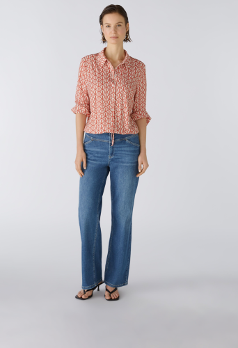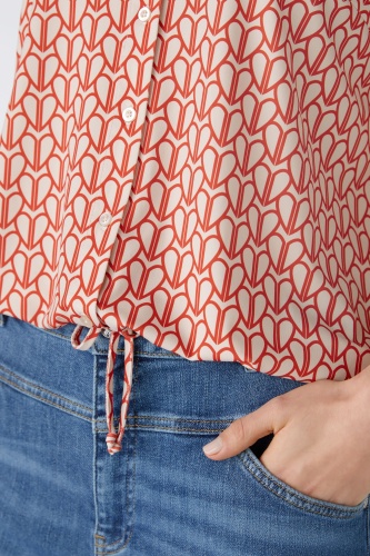 Струящаяся, немнущаяся, шелковистая на ощупь ткань с высоким содержанием эластана, с принтом по всей поверхности. Повседневный крой, укороченная длина. Классический воротник рубашки с планкой на пуговицах во всю длину. Длинный рукав с манжетами, застежка на пуговицы. Пояс можно собрать лентой или носить расстегнутым, прямо, как куртку. Длина для размера 42: 58 см.