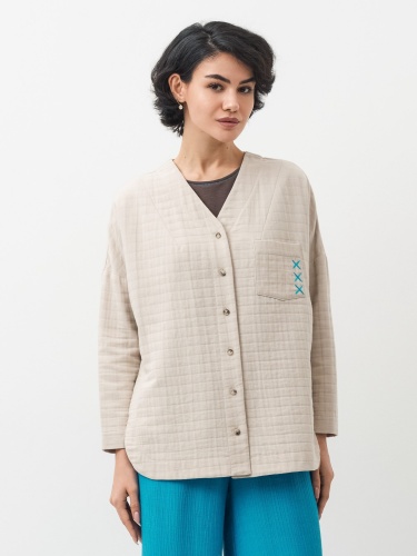 Блузка прямая, свободная. Горловина с А-образным вырезом. На левой полочке, в области груди, накладной карман. Спинка прямая. Рукав чуть заужен книзу. Застежка на пуговицы. Низ блузки закругленный по боковым швам, переходящий в высокие разрезы, обработанные притачной обтачкой.