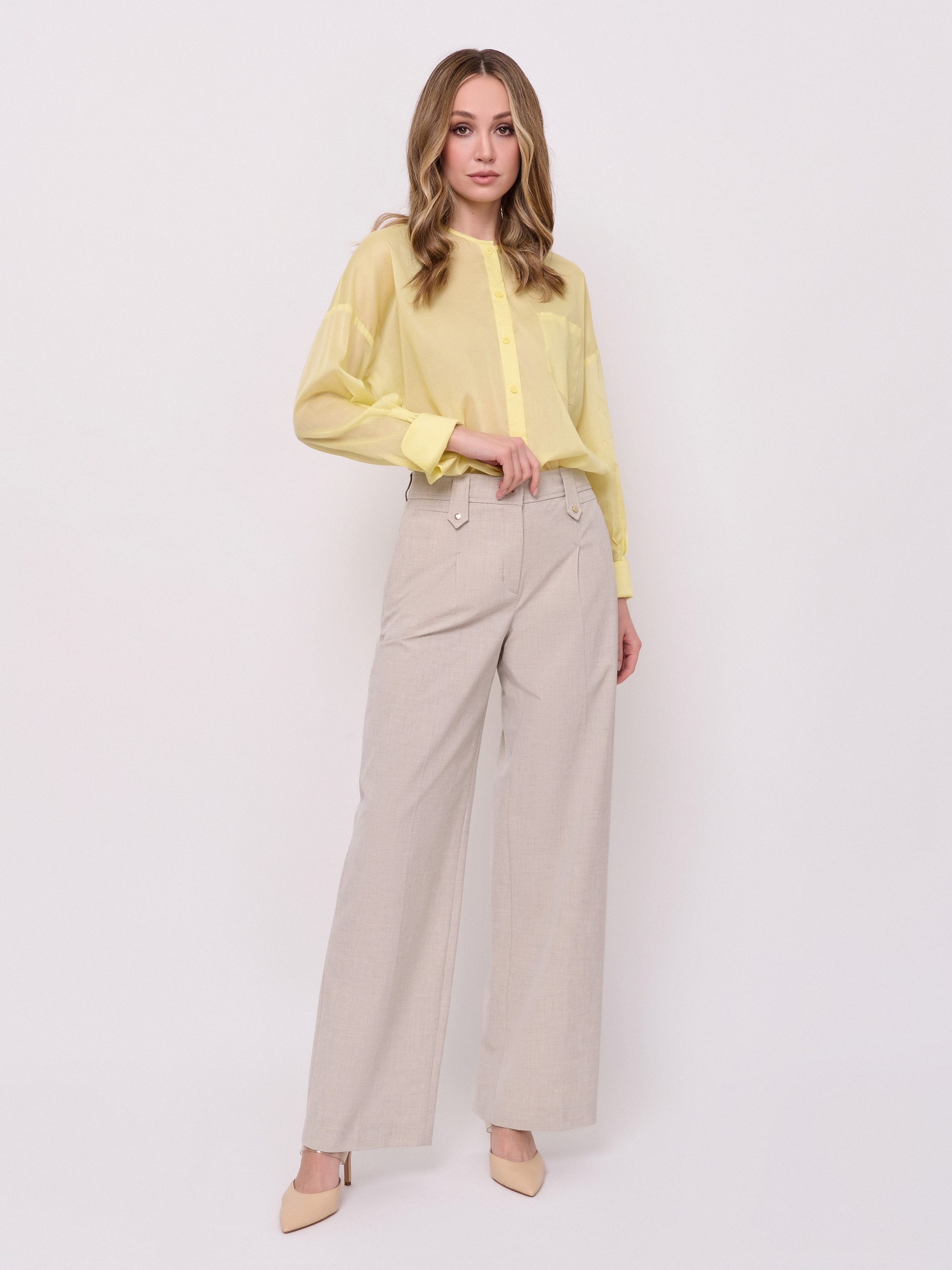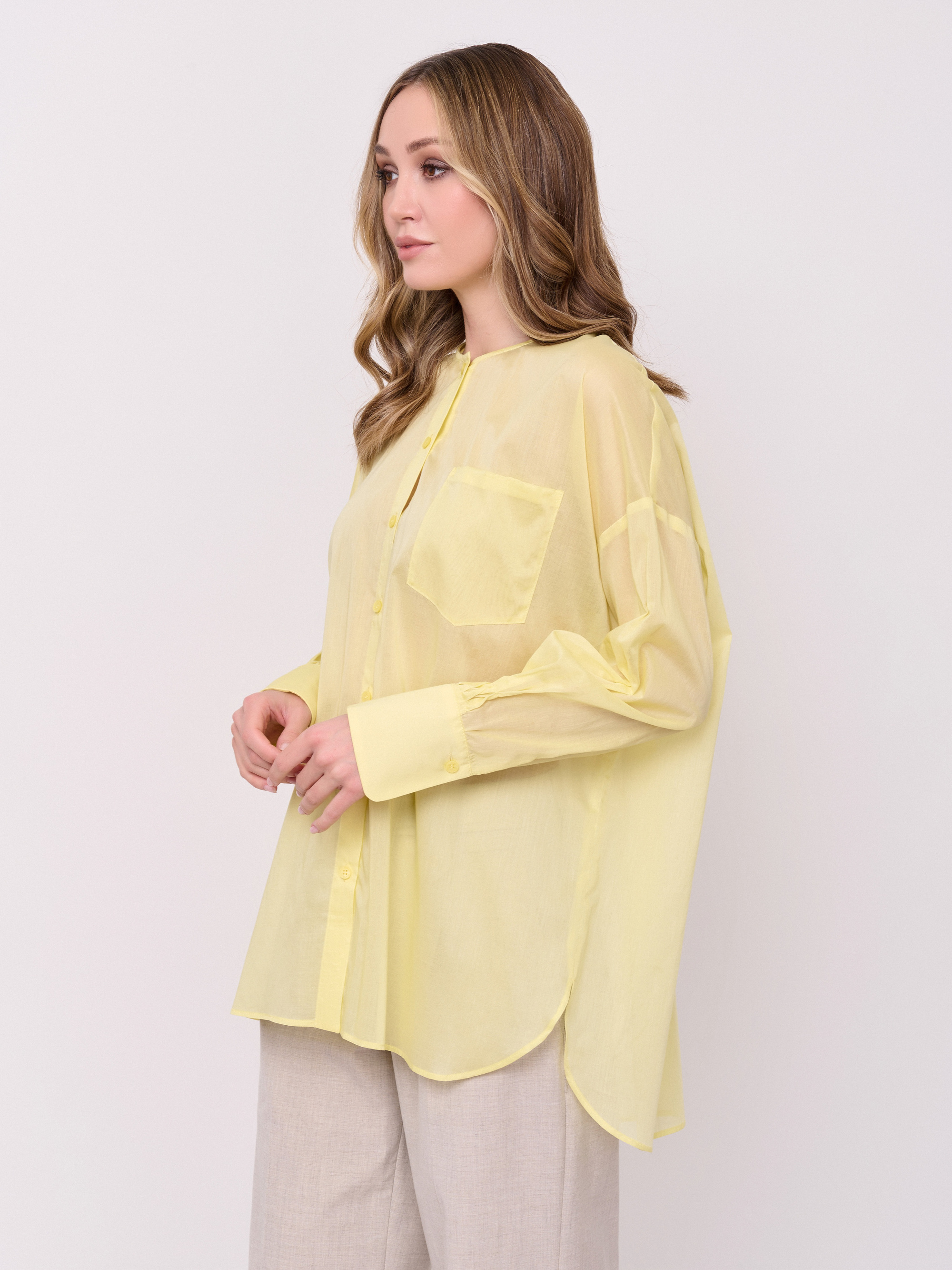 Детали: батист, застежка пуговицы, вырез горловины округлый, рукава длинные, покрой рубашечный, без рисунка, боковые разрезы, накладной карман. Длина по спинке: 74 см.