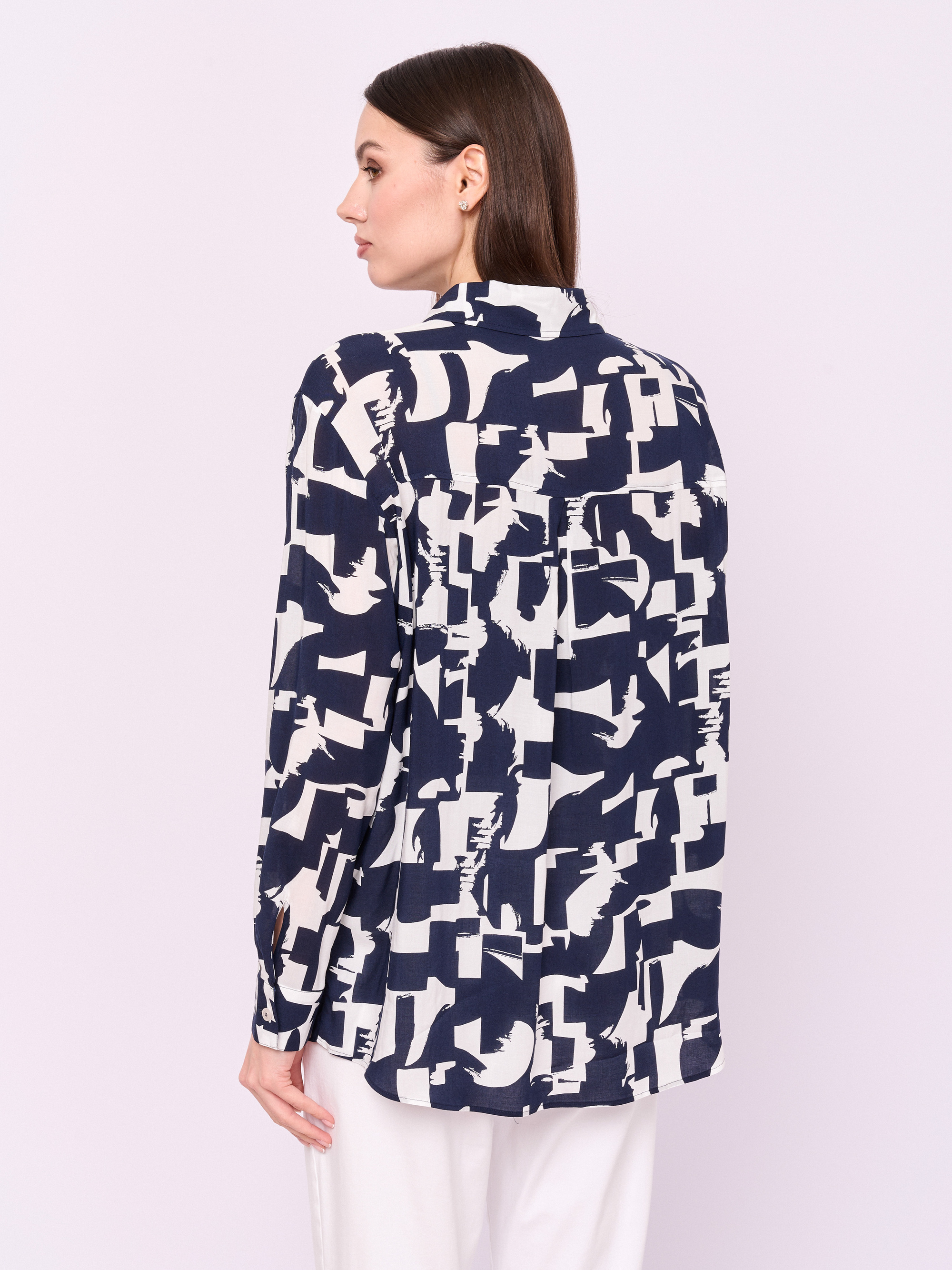 Детали: застежка пуговицы, вырез горловины отложной воротничок, рукава длинные, покрой рубашечный, рисунок абстракция. Длина по спинке: 70 см.