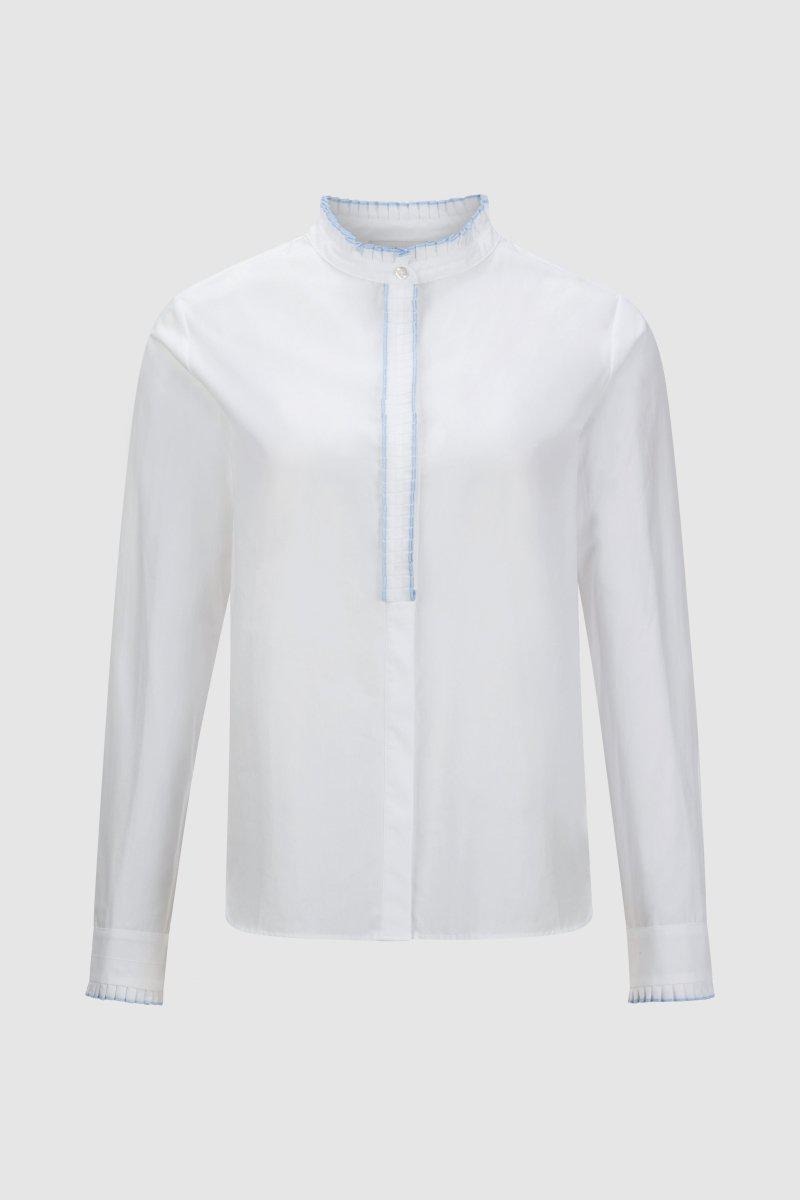 Романтически игривая блузка впечатляет воротником стойкой и рюшами контрастных цветов. Классический топ имеет потайную планку на пуговицах, рукава с манжетами и удивляет непринужденной складкой сзади. Блузка также выигрывает благодаря комфортному органическому хлопку. Длина для размера 42: 64 см. Обхват груди для размера 42: 80 см.