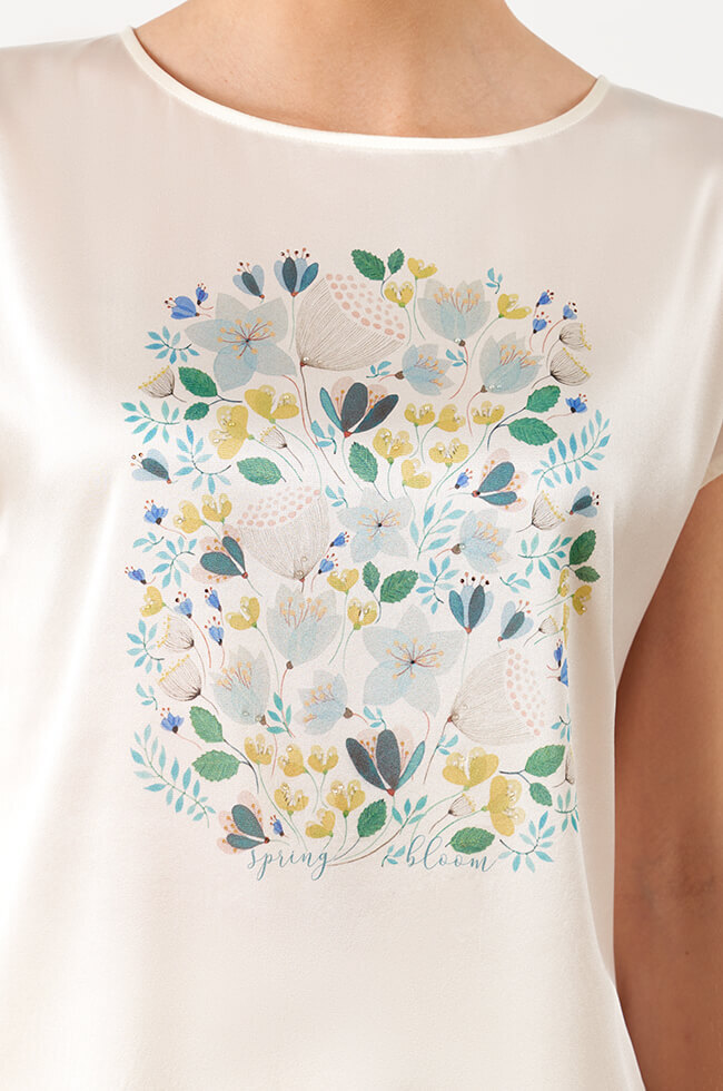 Элегантная топ-туника, выполнена из шелкового полотна. Овальный вырез горловины. Спущенная линия плеча с небольшими цельнокроеными рукавами. Спереди выполнен дизайнерский принт «Полевая россыпь», декорированный стразами.