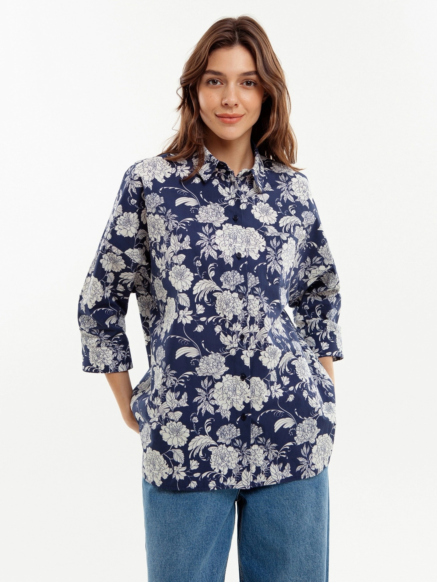 Свободная блуза из принтованной хлопковой ткани. Блуза с классическим отложным воротником и планкой на пуговицах. Рукава широкие с манжетами. На полочке накладкой карман.