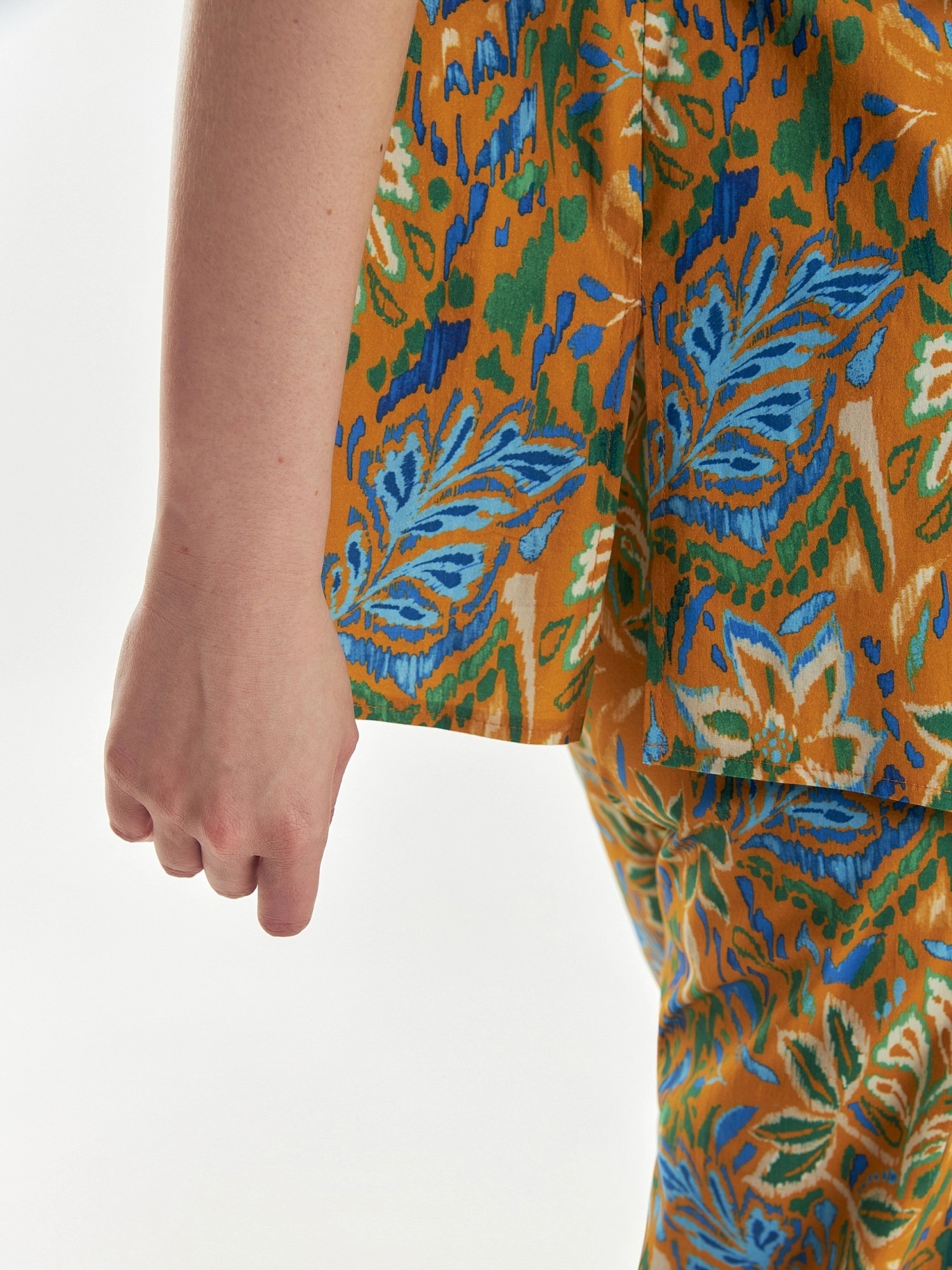 Свободная хлопковая блуза в принте идеально впишется в ваш весенний гардероб. Короткий и широкий рукав позволит активно проводить время в городе. Отложной воротник, застежка на пуговицы. На полочке накладные карманы с клапанами. На спинке кокетка с бантовой складкой. Спинка длине полочки, у блузы есть разрезы по бокам.