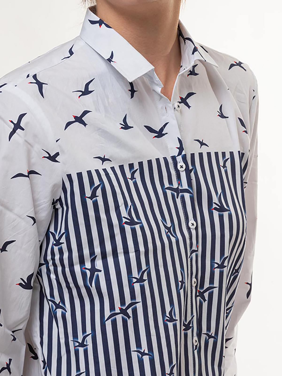 Рубашка классического кроя в морском дизайне. Отложной рубашечный вортник, втачной рукав полной длины с манжетой. Застежка на пуговицы в тон изделия. Удлиненная скругленная спинка.