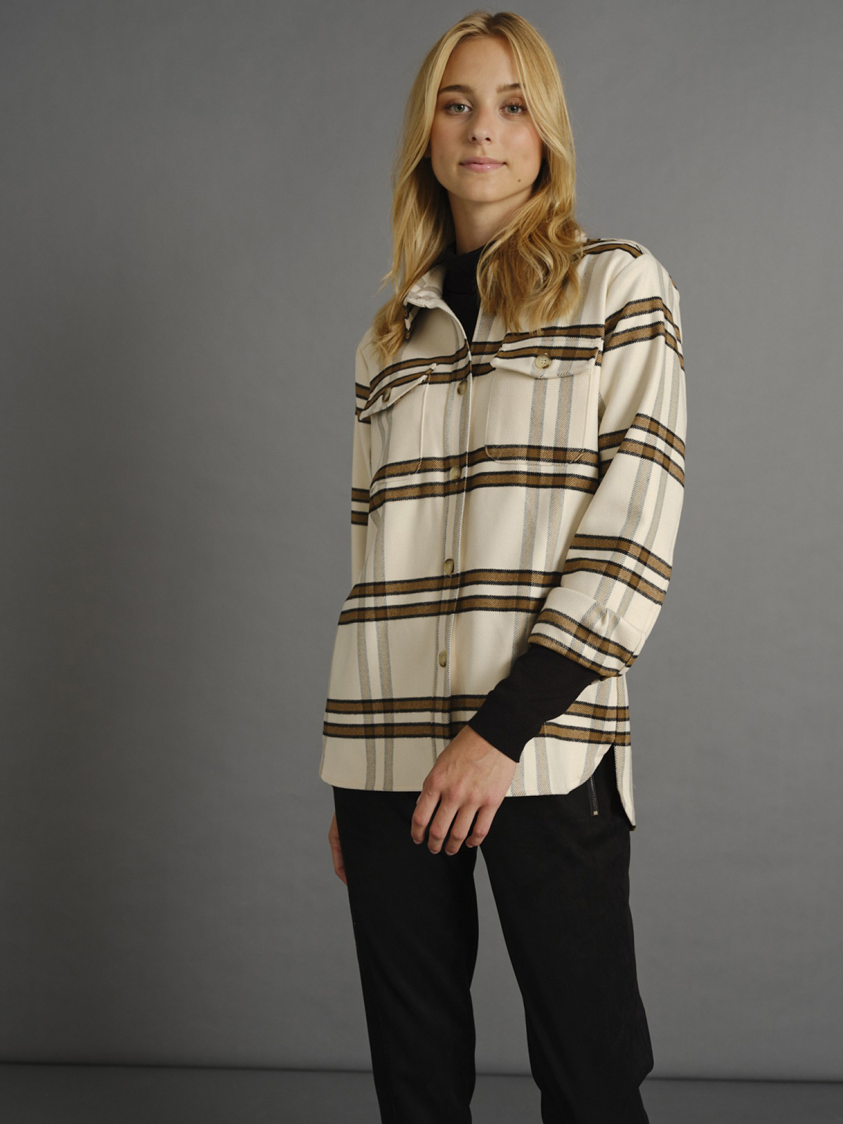 Рубашка в крупную клетку предпочтительно носить с водолазкой или рубашкой и узкими брюками или джинсами. свободная, прямая форма; планка с пуговицами и отложной поротник; длинные рукава с манжетами на пуговицах; два нагрудных кармана с клапанами и пуговицами; закругленный подол рубашки; Длина по размеру 42 (российский) = 72 см