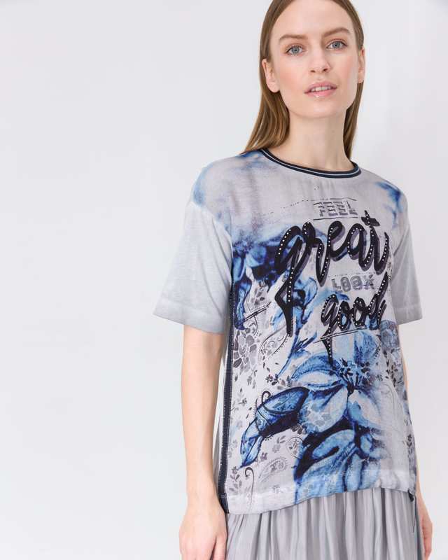 Блузка свободного кроя с абстрактным принтом спереди. Короткий втачной рукав, спущенная линия плеч. Круглый вырез горловины обрамлен контрастной бейкой.