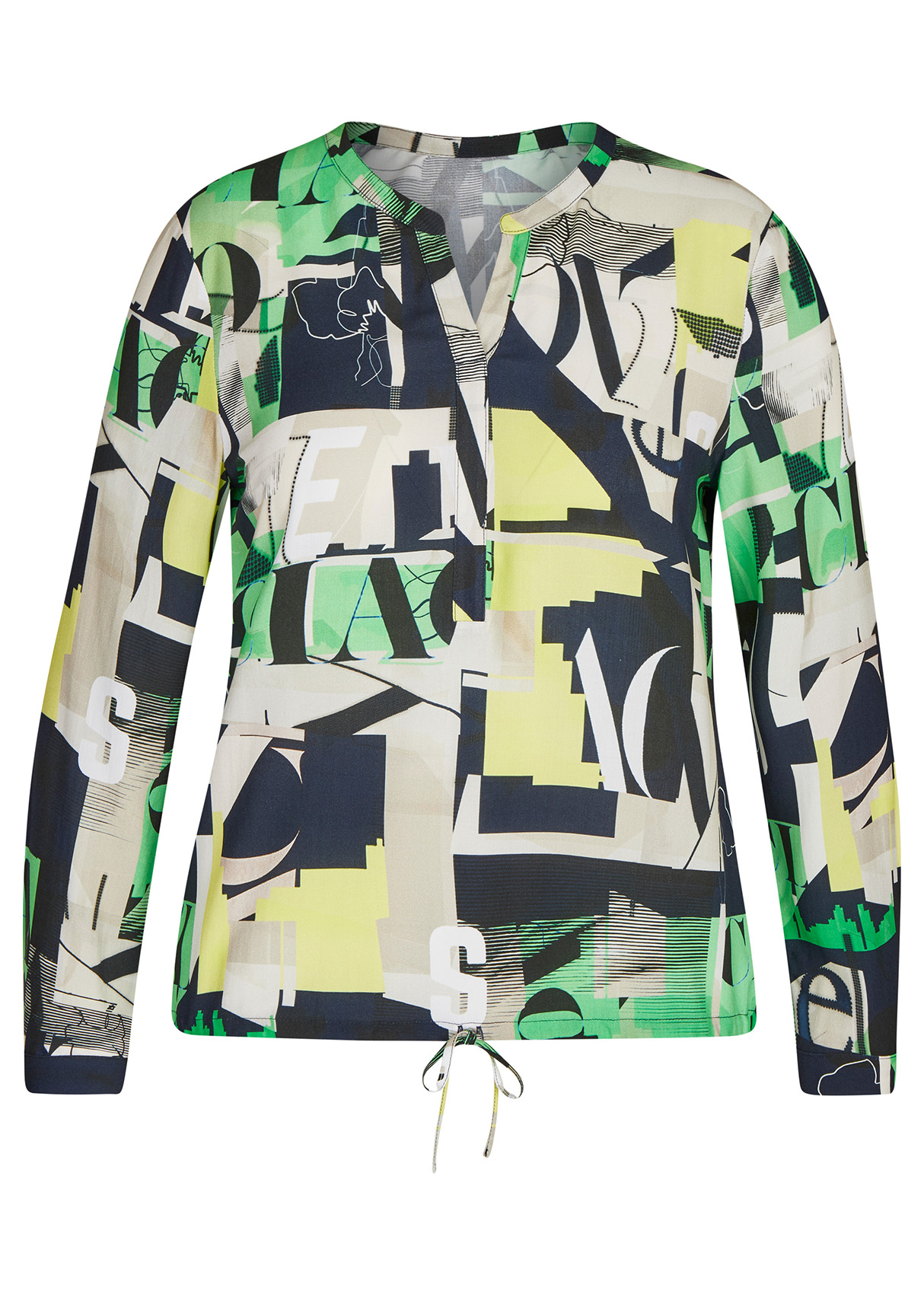 Яркая блузка в абстрактном дизайне. Втачной рукав полной длины, круглый вырез горловины. Кулиска по низу изделия.