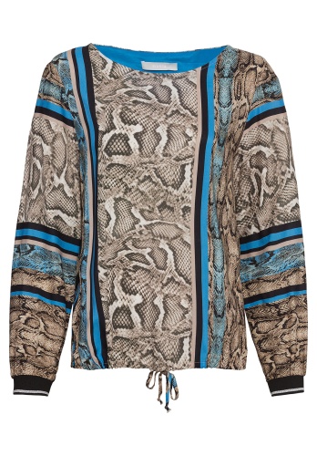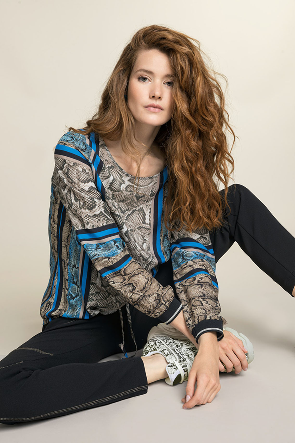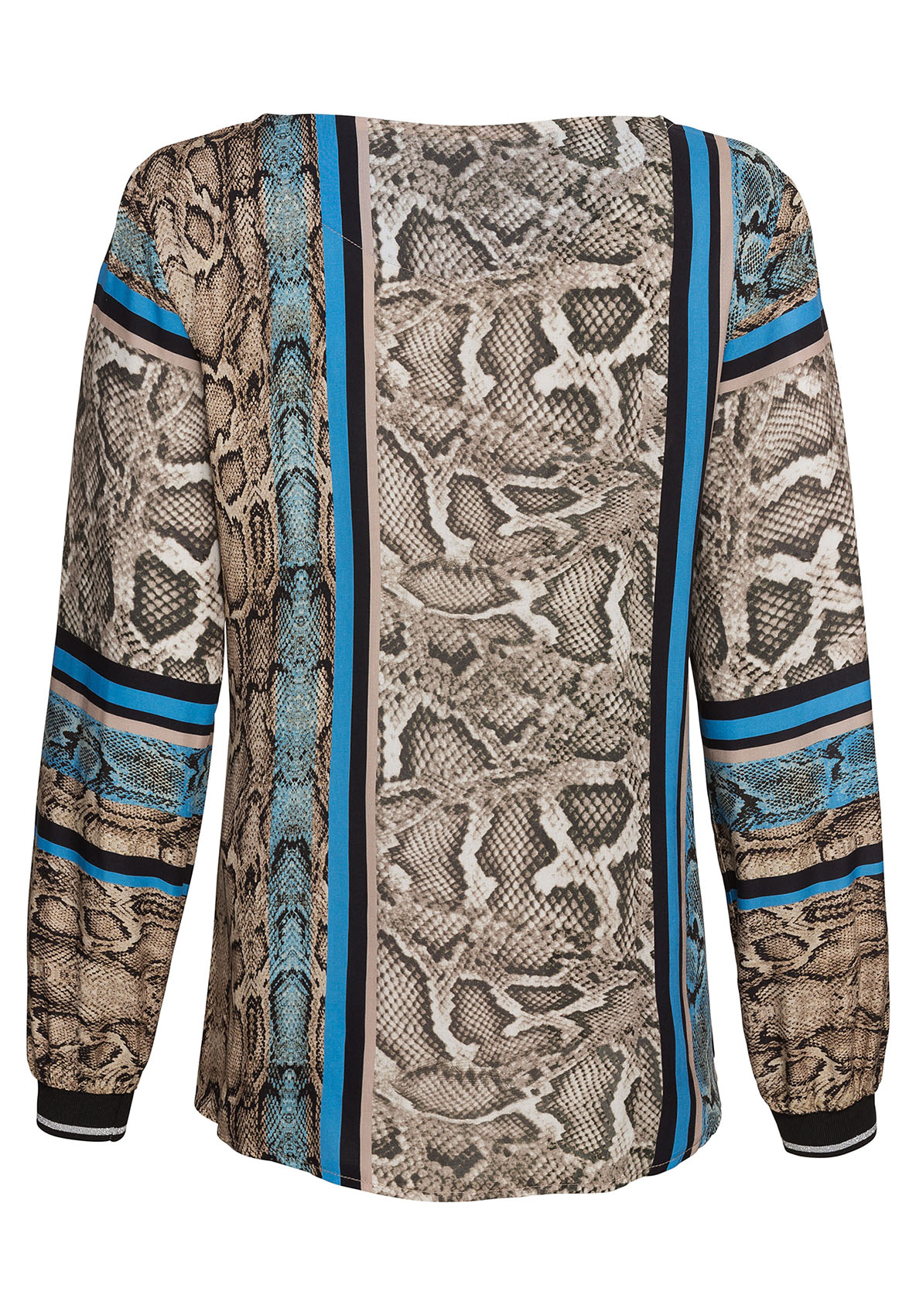 В дизайне блузы Anra сочетаются модный змеиный принт и трендовый эффект колор-блок. Мягкое вискозное полотно приятно и удобно в ношении. Рукава блузы можно закатать благодаря трикотажным манжетам. Кулиска на поясе позволяет регулировать прилегание изделия. Эта блуза - великолепный стильный выбор на любой случай. • блузка со змеиным принтом • 100% вискоза • трикотажные манжеты, кулиска по низу • прямой покрой • длина около 65 см