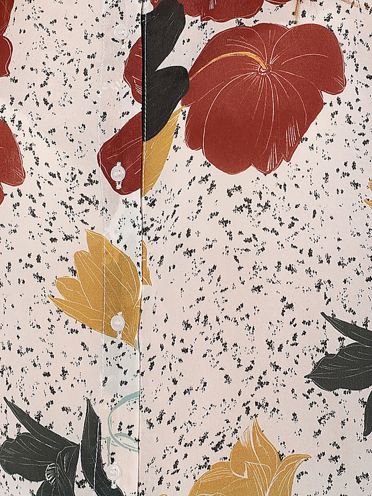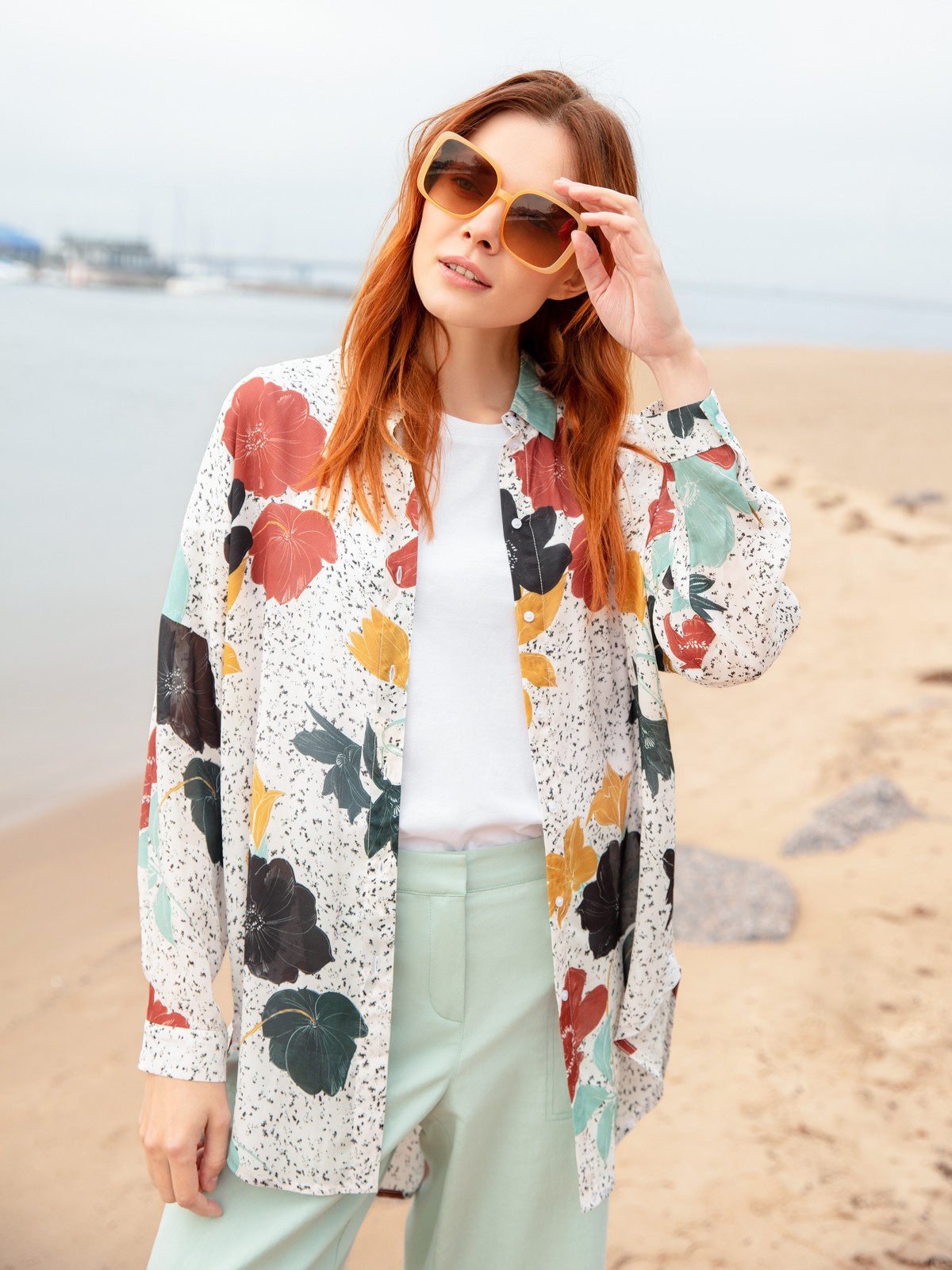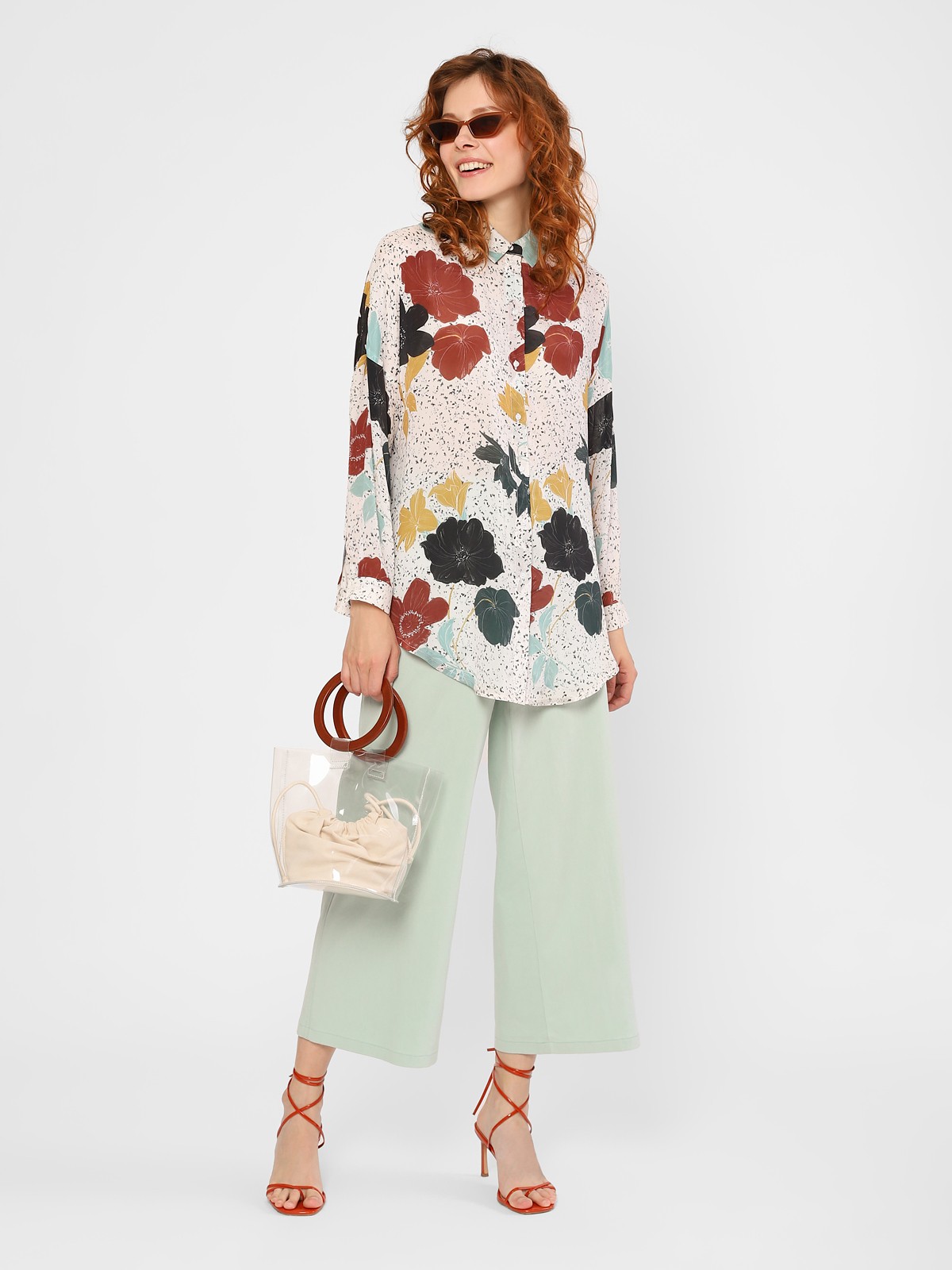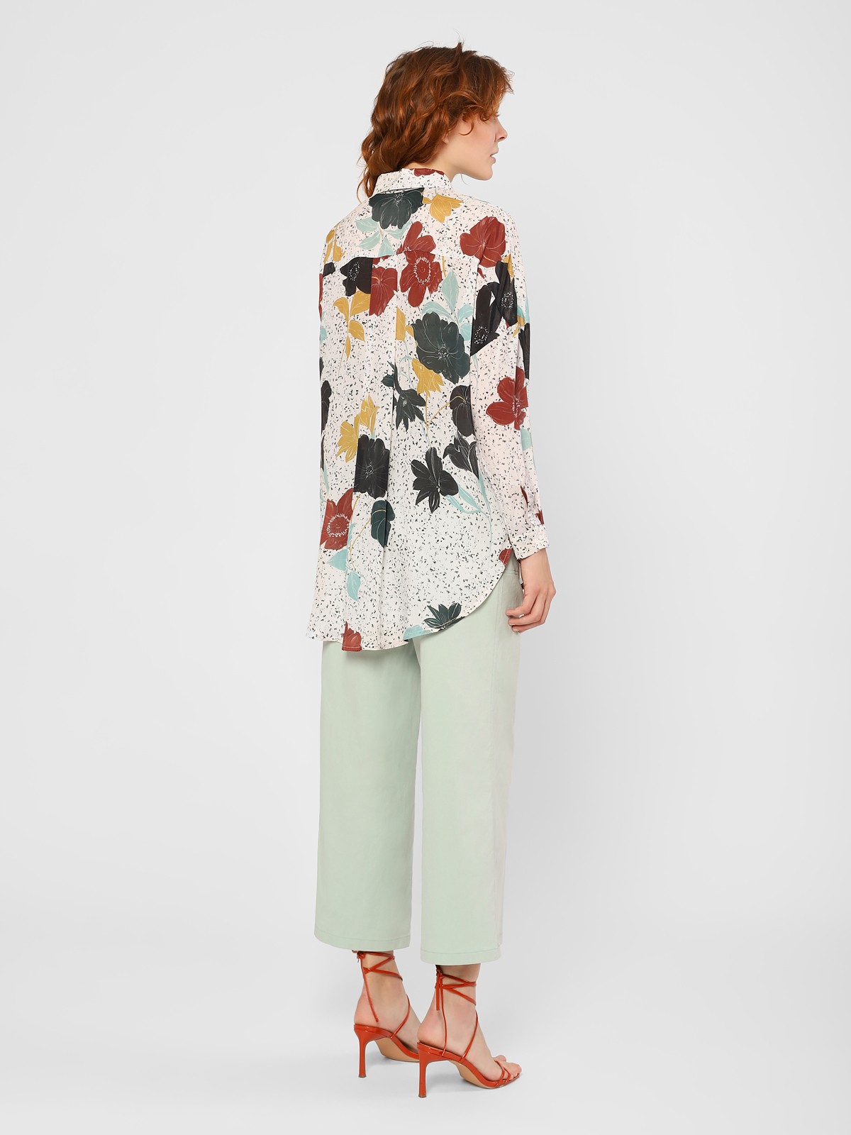 Блуза из смеси вискозы и шелка прямого удлиненного силуэта с классическим отложным воротником, спущенным плечом и втачным рукавом на манжете. Застежка спереди на пуговицы. Низ спинки удлиненный и закругленный, по бокам разрезы.