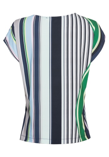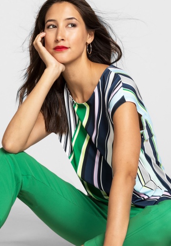 Полосы повсюду - модные акценты с блузой Julie! Блуза имеет стильный дизайн в полоску и подходит для любого случая. Легкая в уходе мягкая ткань джерси с эластаном очень удобна в ношении. Цветные полосы и складки сбоку создают вау-эффект. Цельнокроеные рукава и круглый вырез горловины придают изделию завершенный вид. • блуза с цветными полосами и складками сбоку • легкая в уходе ткань джерси с эластаном • круглый вырез, цельнокроеный рукав • слегка приталенный силуэт • длина около 64 см