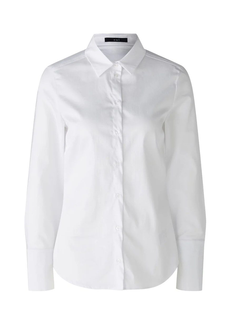 Классическая блузка-рубашка слегка сатинированного вида с манжетами на рукавах. Эластичная хлопковая смесь с легким атласным блеском. Приталенный крой, стандартная длина. Классический воротник рубашки с застежкой на пуговицы по всей длине. Длинный рукав с манжетой. По спинке кокетка и вытачки для формирования талии.
