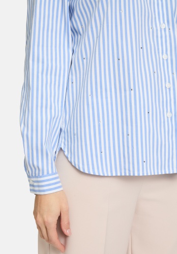 Повседневная блузка-рубашка с рубашечным воротником привнесет классический стиль в ваш гардероб. Полосатый рисунок и стразы придают блузке современный и свежий вид, а свободный крой обеспечивает высокий комфорт. Планка с пуговицами позволяет индивидуально подогнать блузку. Блузка идеально подходит для повседневных нарядов для отдыха, ее можно комбинировать различными способами, и она придаст любому образу непринужденную элегантность.
