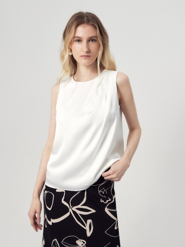 Прямая блуза из молочного атласа с круглой горловиной и складками по плечу. На спинке капелька и пуговицы.