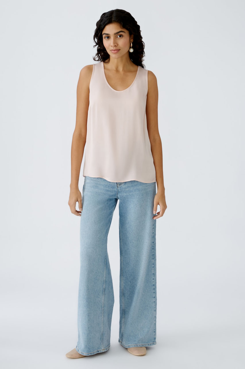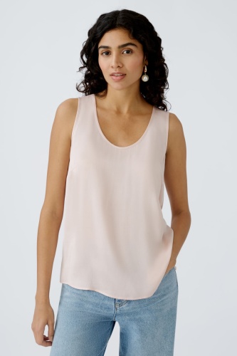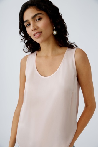 Блуза выполнена в нежном персиковом оттенке, который придает ей легкость и женственность. Модель имеет свободный крой без рукавов, что делает её идеальной для теплой погоды или многослойных образов. Вырез горловины оформлен в классической округлой форме, добавляющей изделию элегантность. Ткань гладкая и струящаяся, обеспечивающая комфорт и приятное ощущение при носке. Эта блуза прекрасно подходит для создания как повседневных, так и более нарядных образов.