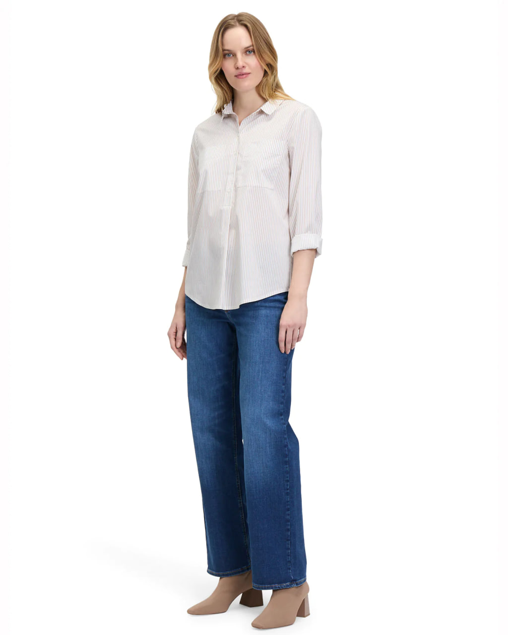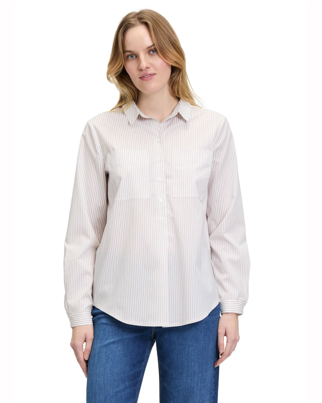 Рубашка Betty&Co бело-бежевого цвета в вертикальную узкую полосу. Модель с отложным воротником и планкой на шесть пуговиц, рукава с узкими манжетами, накладные карманы на груди. Рубашка отлично впишется в ваш гардероб.