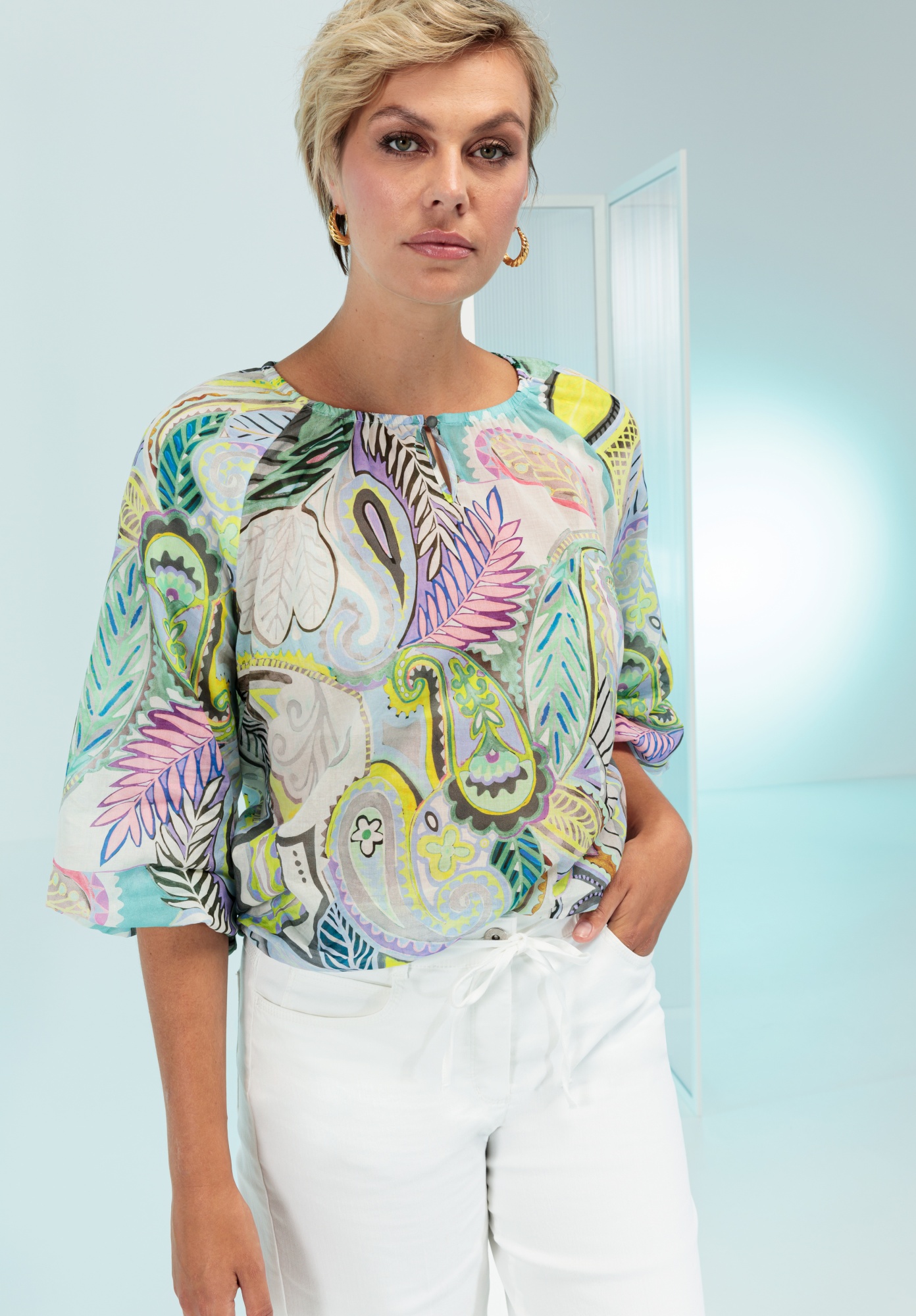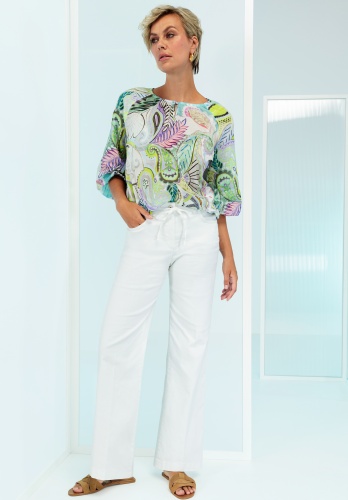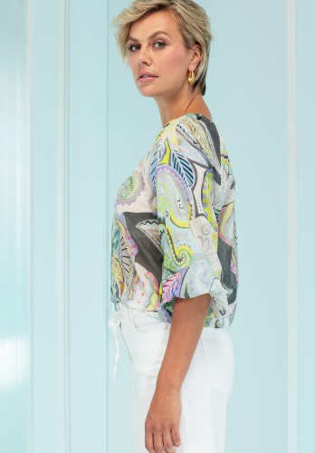 Стильная блузка с принтом «Рана» добавит свежести и лёгкости вашему гардеробу благодаря летнему принту по всей поверхности. Круглый вырез горловины с небольшой застёжкой на пуговицы и свободный крой создают женственный силуэт, а эластичный подол — непринуждённость. Рукава длиной ¾ делают её идеальным дополнением для тёплых дней. Идеально сочетается с джинсами или лёгкими брюками для создания стильного образа!