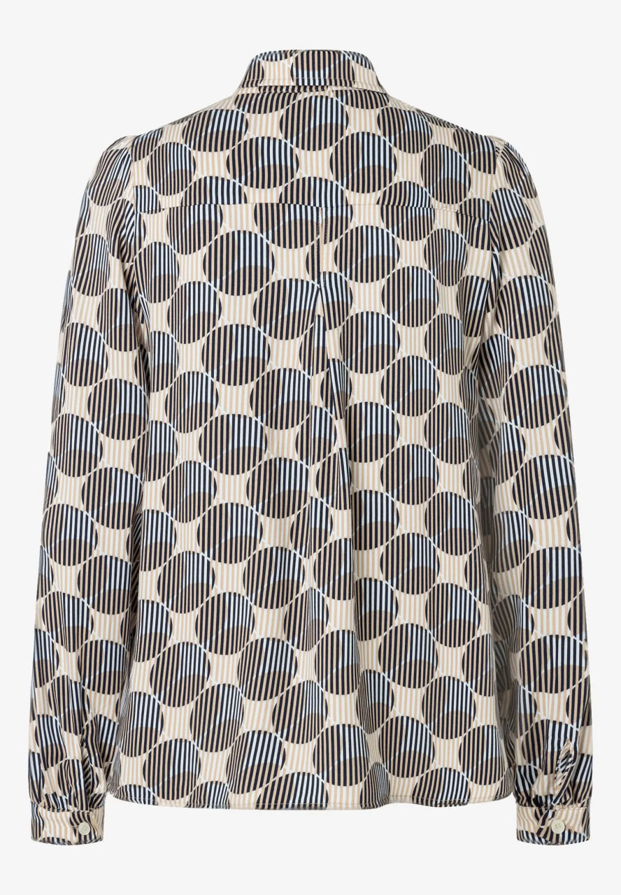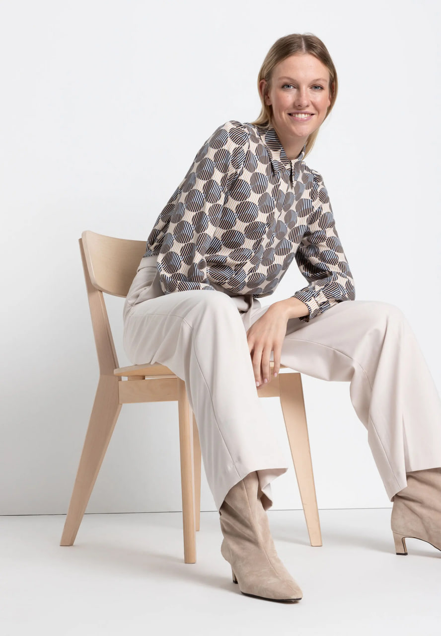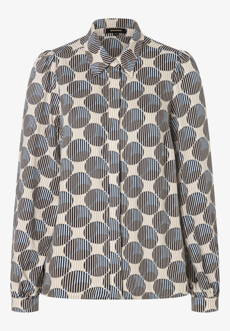 Струящаяся вискозная блузка MORE & MORE с графическим принтом в темно-синем и бежевом цветах отлично смотрится с джинсами, но ее также можно носить с классическими деловыми брюками.