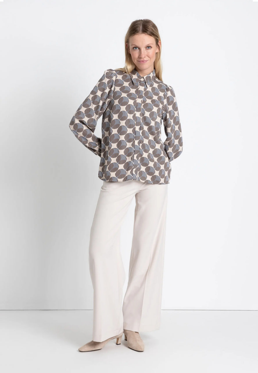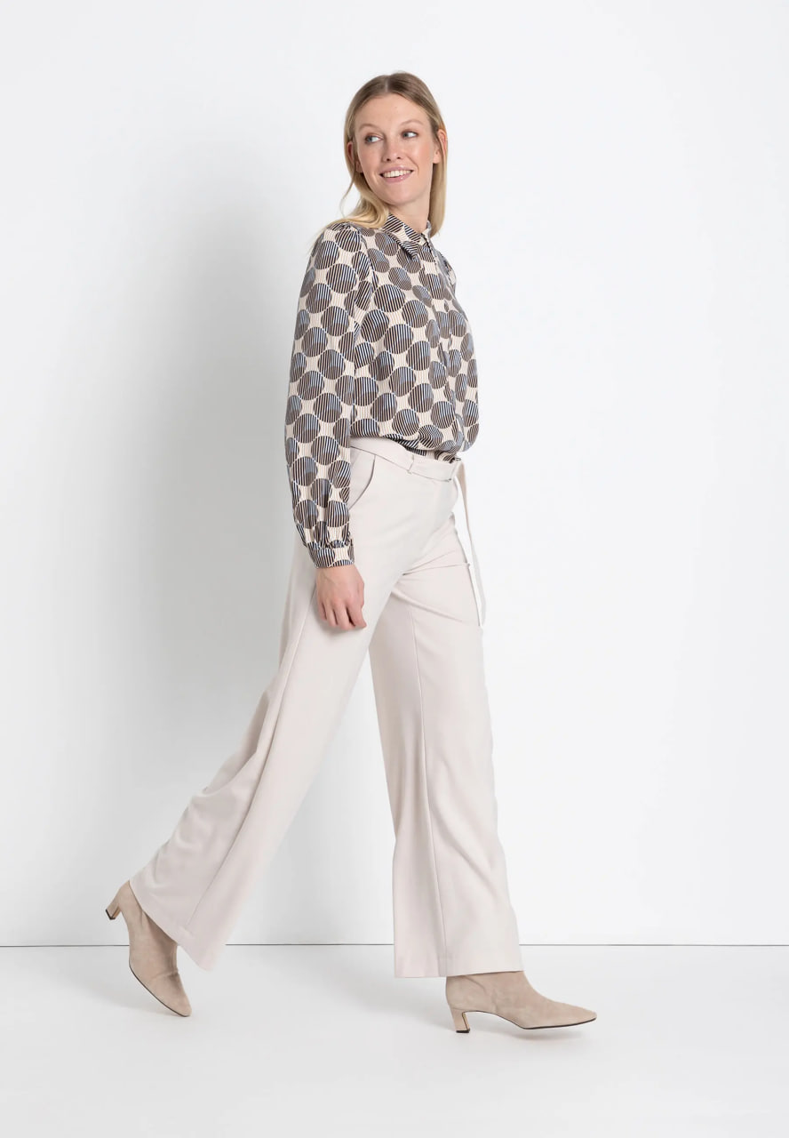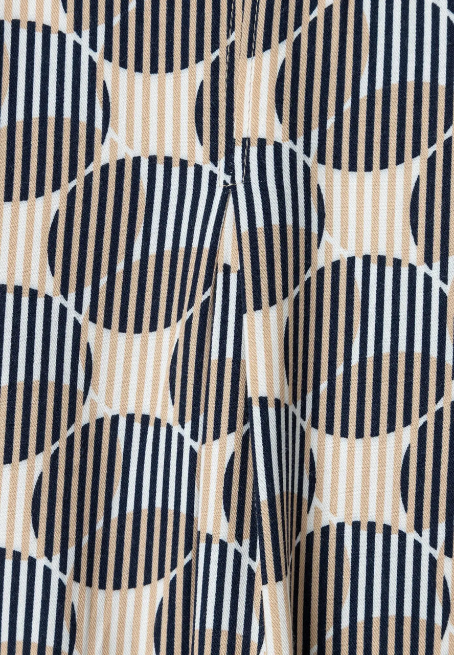 Струящаяся вискозная блузка MORE & MORE с графическим принтом в темно-синем и бежевом цветах отлично смотрится с джинсами, но ее также можно носить с классическими деловыми брюками.