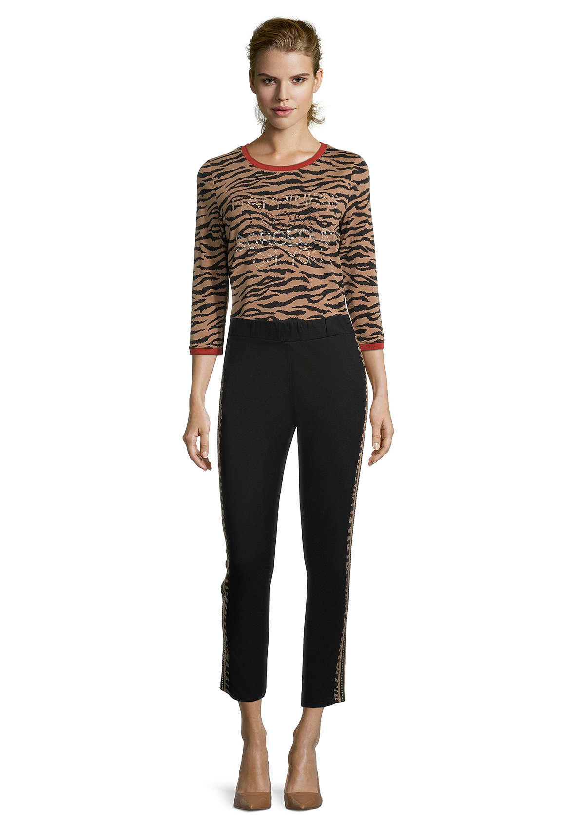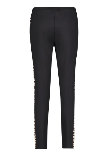 Укороченные брюки в сопртивном стиле. Средняя посадка с эластичной лентой на поясе обеспечивают удобство в ношении. Яркий акцент модели - вставки-лампасы с анималистическим принтом. Приятный к телу материал из вискозной смеси.