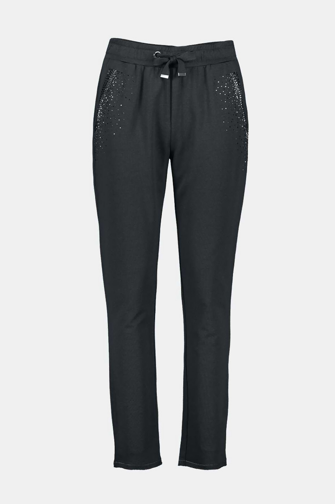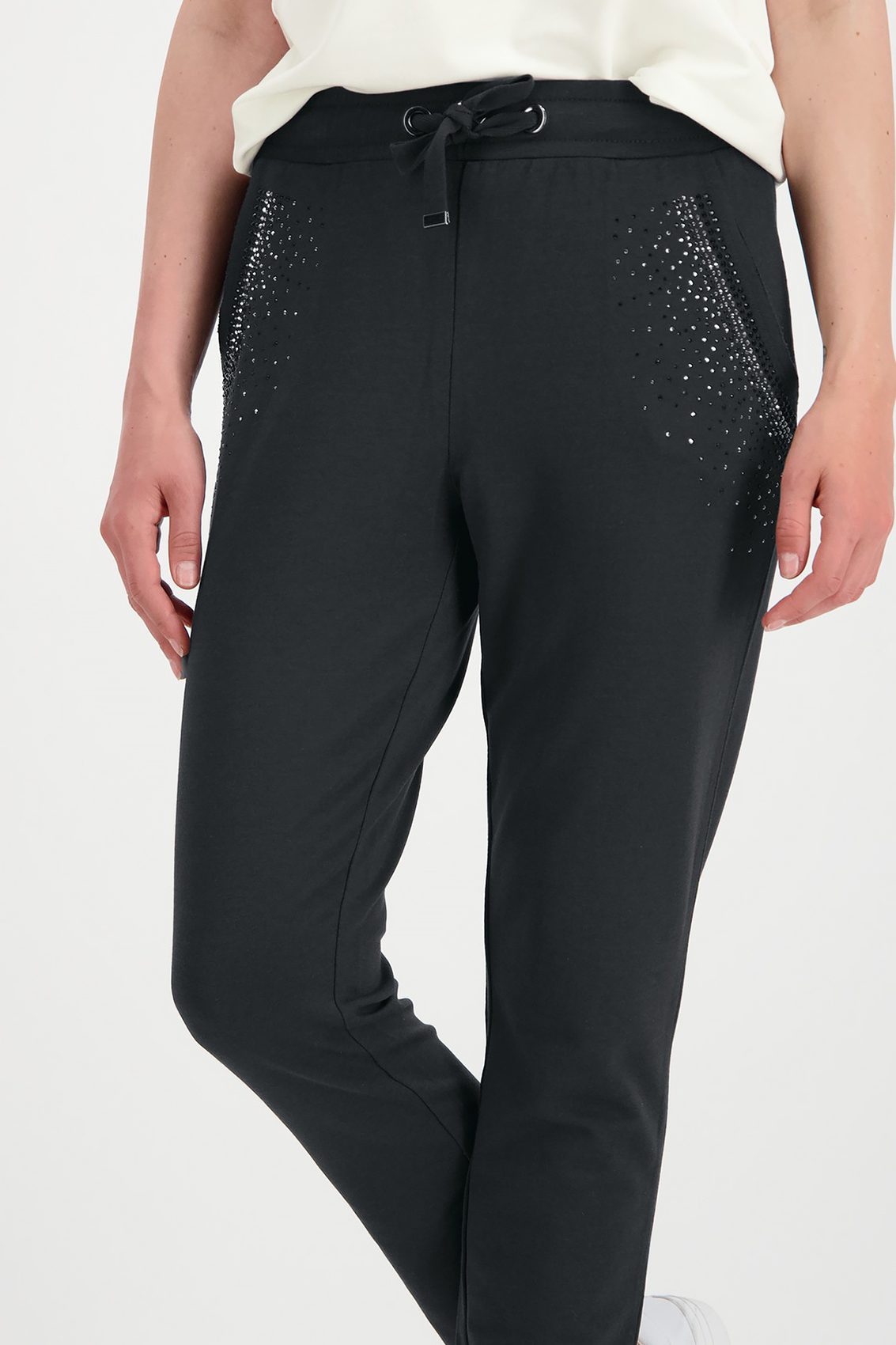 Брюки спортивного стиля. Эластичный пояс с кулиской обеспечивает удобную посадку и комфортное ношение. Мягкий и приятный телу материал. Боковые карманы украшены стразами. Сзади накладные карманы.