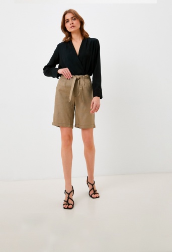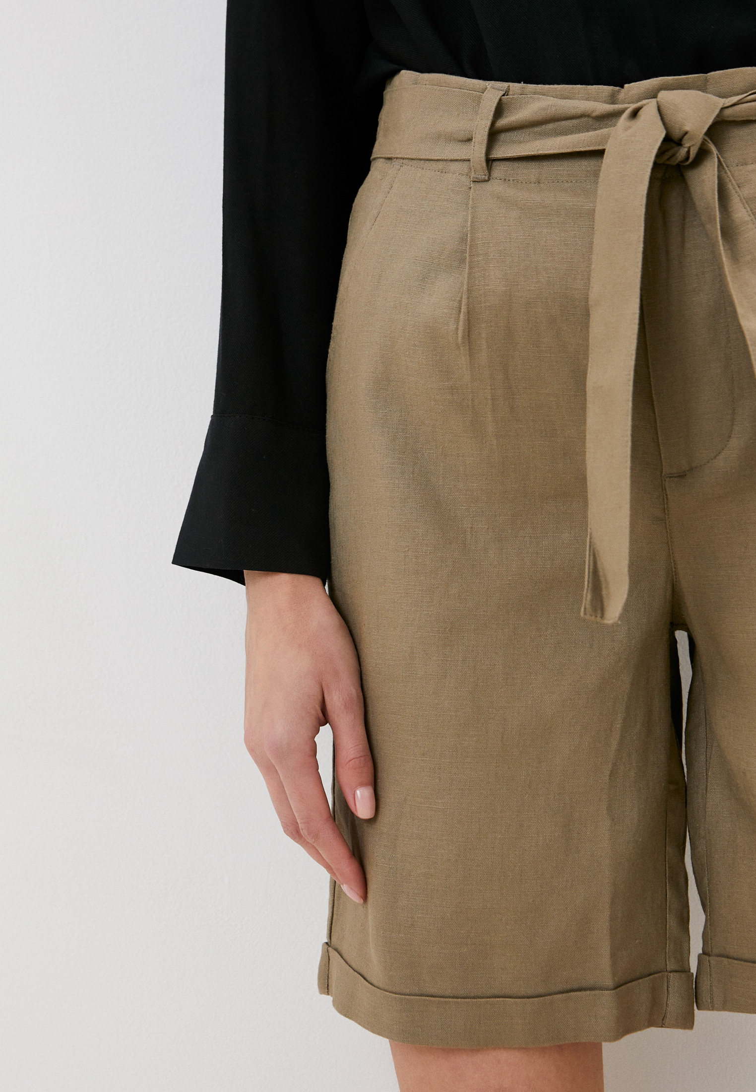 На сайте указаны Российские размеры. Однотонные шорты из смеси льна и вискозы незаменимы в теплую летнюю погоду. Материал обеспечивает правильную терморегуляцию и приятен к телу. Длина шорт выше колена, имеются стрелки и отвороты. Застежка на скрытую молнию и пуговицу. В комплекте идет пояс в тон изделия. Боковые внутренние карманы, задние карманы отсутствуют. Фигурные вытачки и пояс со шлевками обеспечивают комфортную посадку.