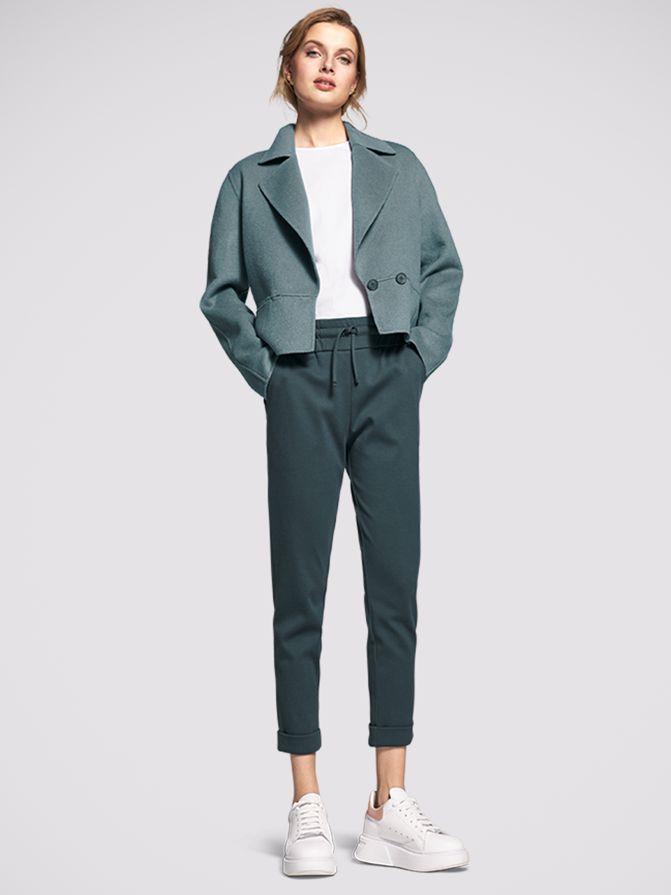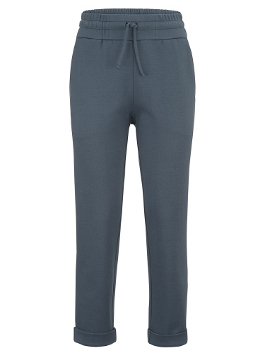 Укороченные брюки в спортивном стиле из 100%-го хлопка. Широкий эластичный пояс с кулиской. Подвороты по низу штанин.