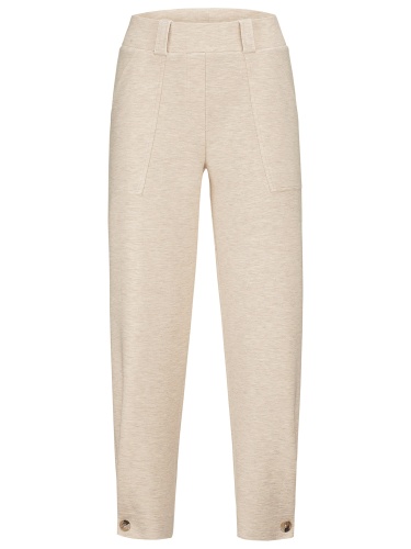 Укороченные брюки в спортивном стиле из смесовой вискозы. Широкий эластичный пояс с кулиской. Пуговицы по низу штанин, накладные карманы.