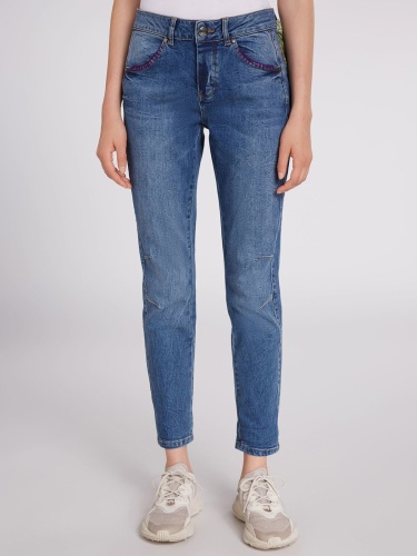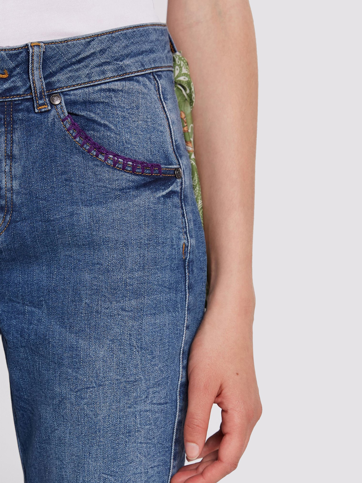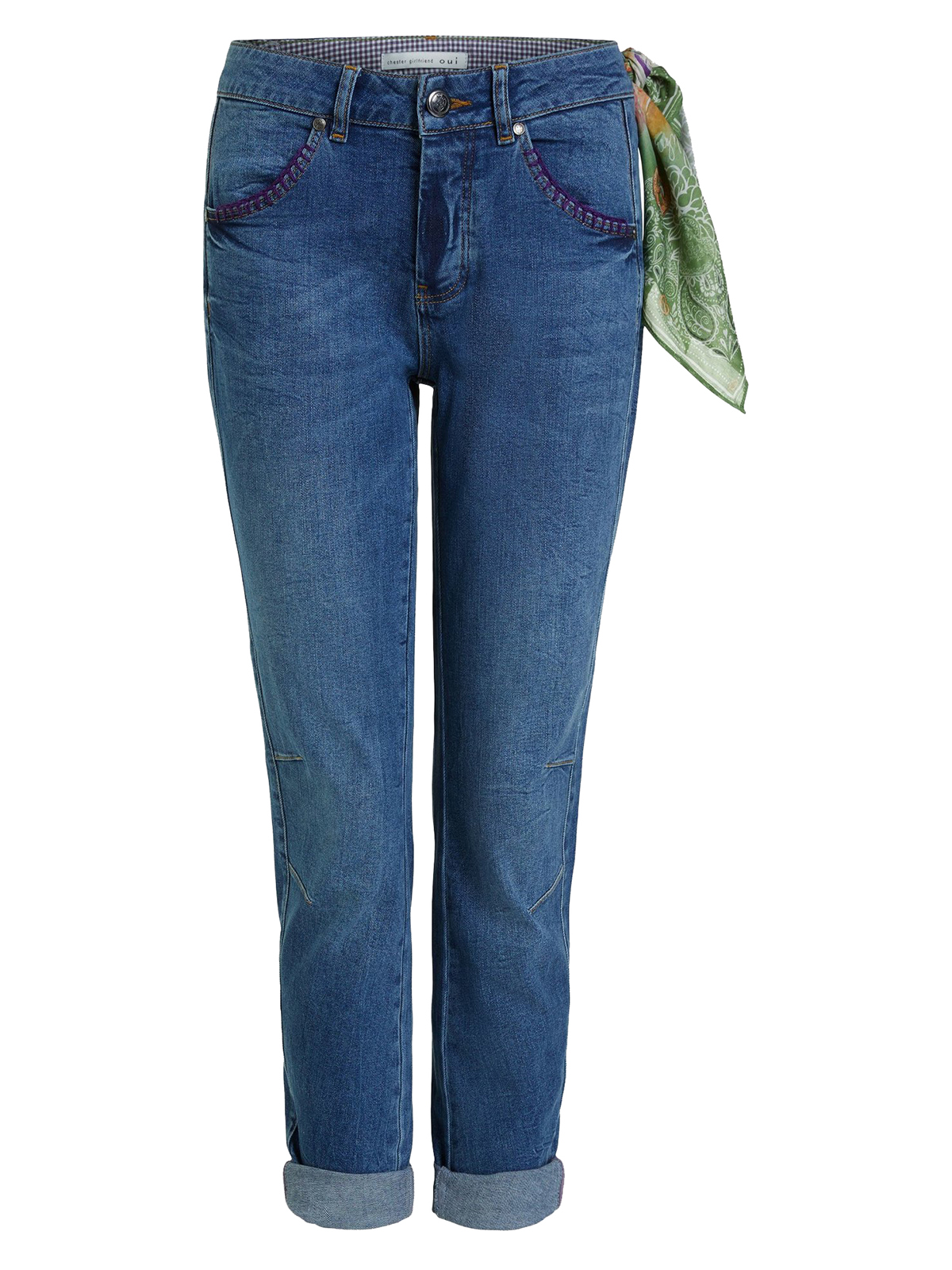 Укороченные джинсы с потертостями и декоративными вытачками на коленях. Комфортная средняя посадка, притачной пояс со шлевками. В комплекте идет стильный платок, который рекомендуется повязывать на одну из шлевок в качестве акцентной детали. Рост модели 178 см, ее размер – 42 (российский).
