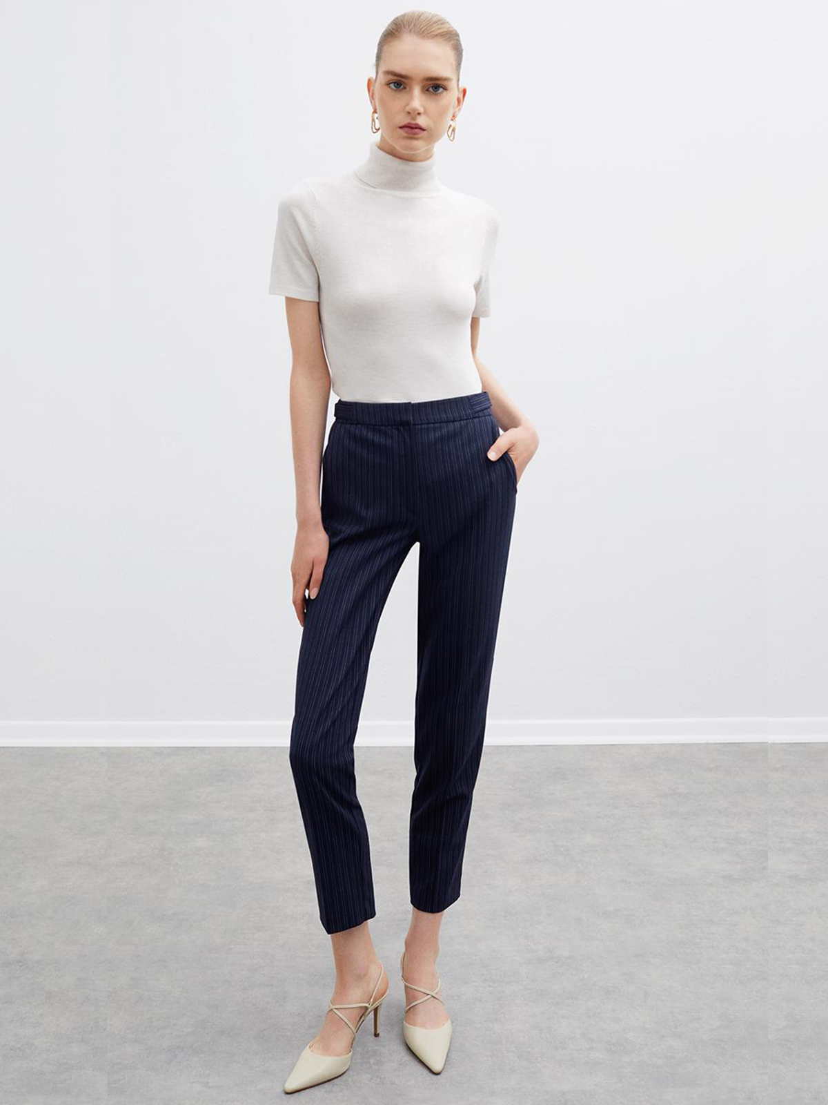 Укороченные брюки насыщенного синего оттенка с контрастной полоской. Высокая посадка, притачной пояс со шлевками, застежка на скрытую молнию. Боковые карманы. Брюки подойдут для создания образа в деловом стиле.