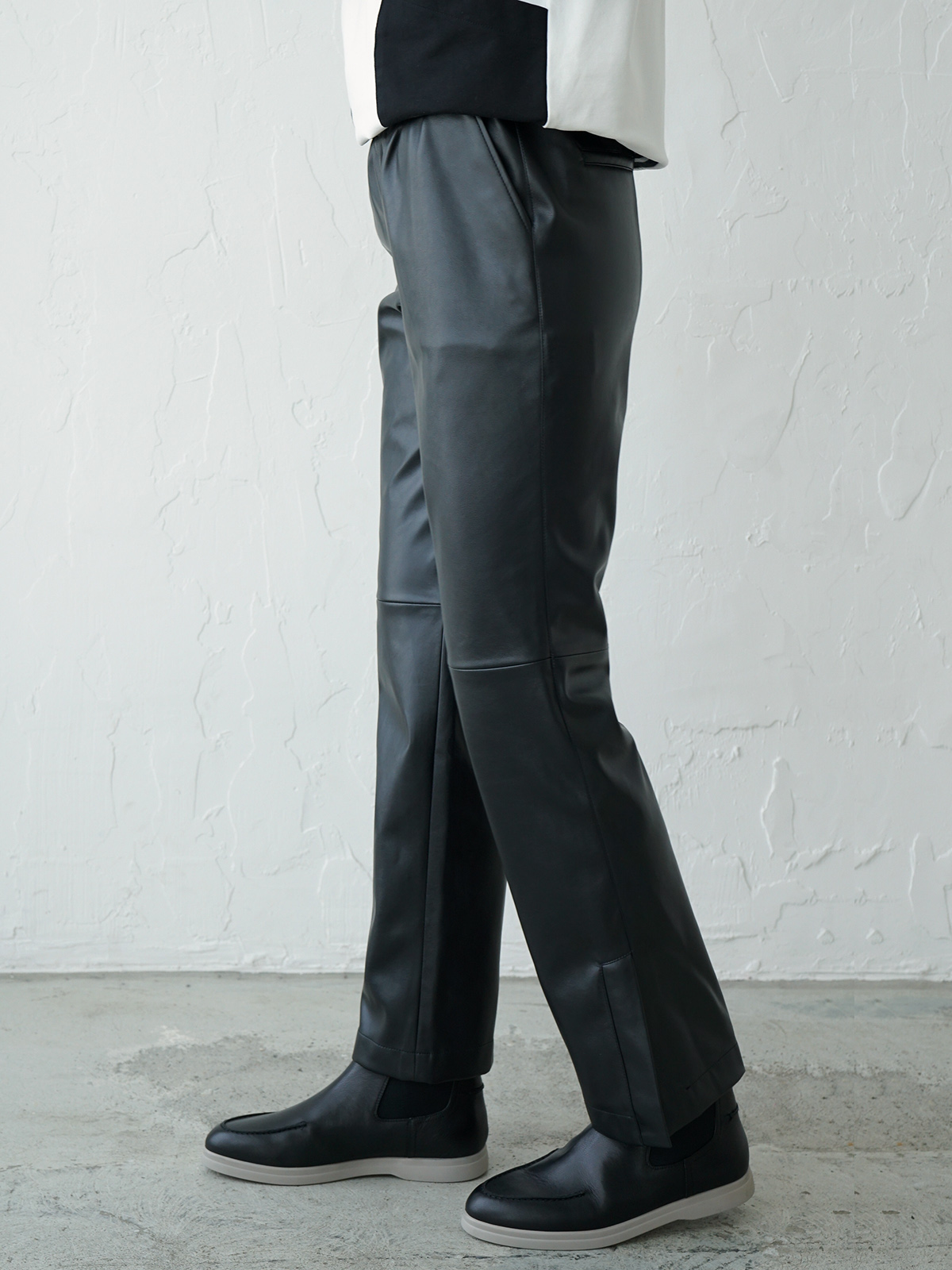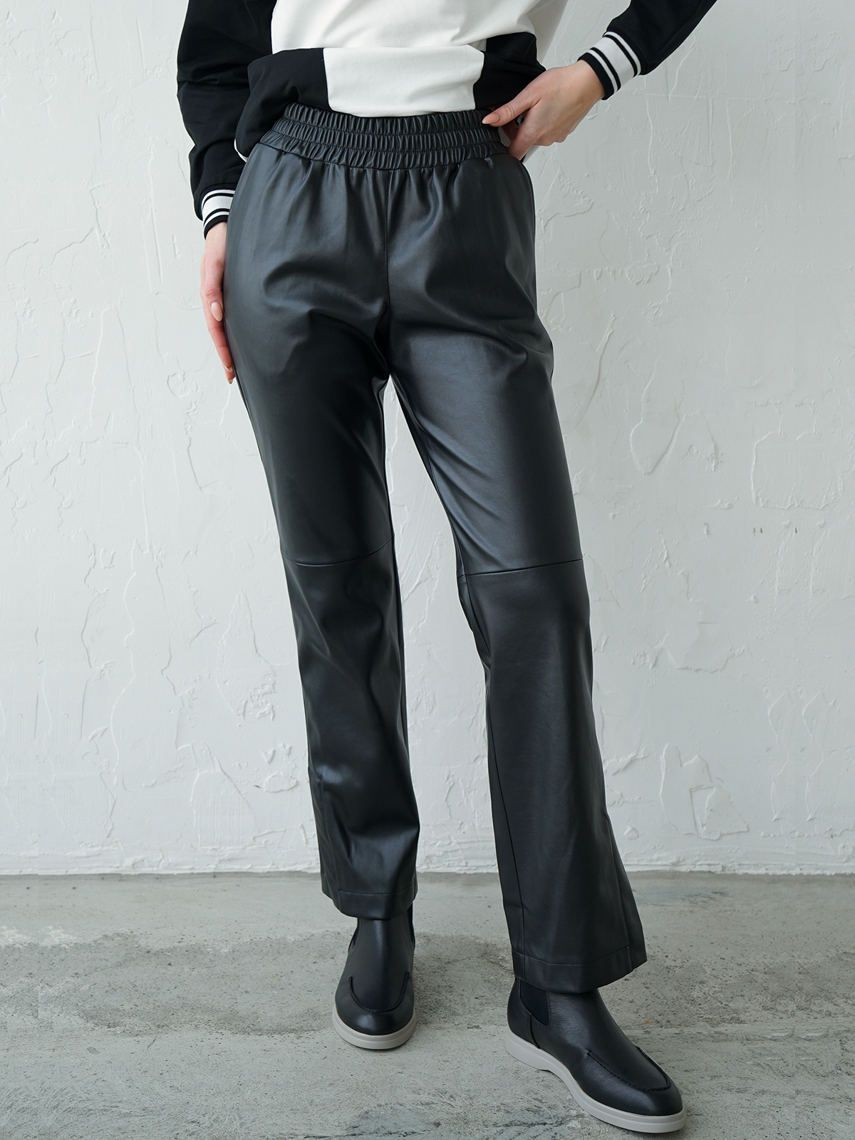 На сайте указаны российские размеры. Черные брюки из экокожи – тренд сезона! Прямой крой. Комфортная высокая посадка, широкий эластичный пояс обеспечивает удобство ношения. Боковые карманы в шве. Боковые разрезы по низу штанин. Ткань: качественная искусственная кожа (55% полиуретан, 40% поливискоза, 5% эластан). Практичный материал, загрязнения с которого легко удаляются влажной салфеткой, что особенно актуально в межсезонье. Крой: стильные брюки свободного прямого силуэта с удобным поясом-резинкой, который подчеркивает линию талии и закрывает область живота. Имеют правильный крой, благодаря чему брюки идеально садятся на разные типы фигуры. В удобных карманах в боковых швах можно легко уместить телефон и банковские карты. Отделка: модель выделяется необычной конструкцией, состоящей из двух деталей, соединенных крепкой строчкой в цвет брюк. Имеют изящные разрезы по низу, которые добавляет комфорта при передвижении, а еще позволяют носить их с различной обувью.