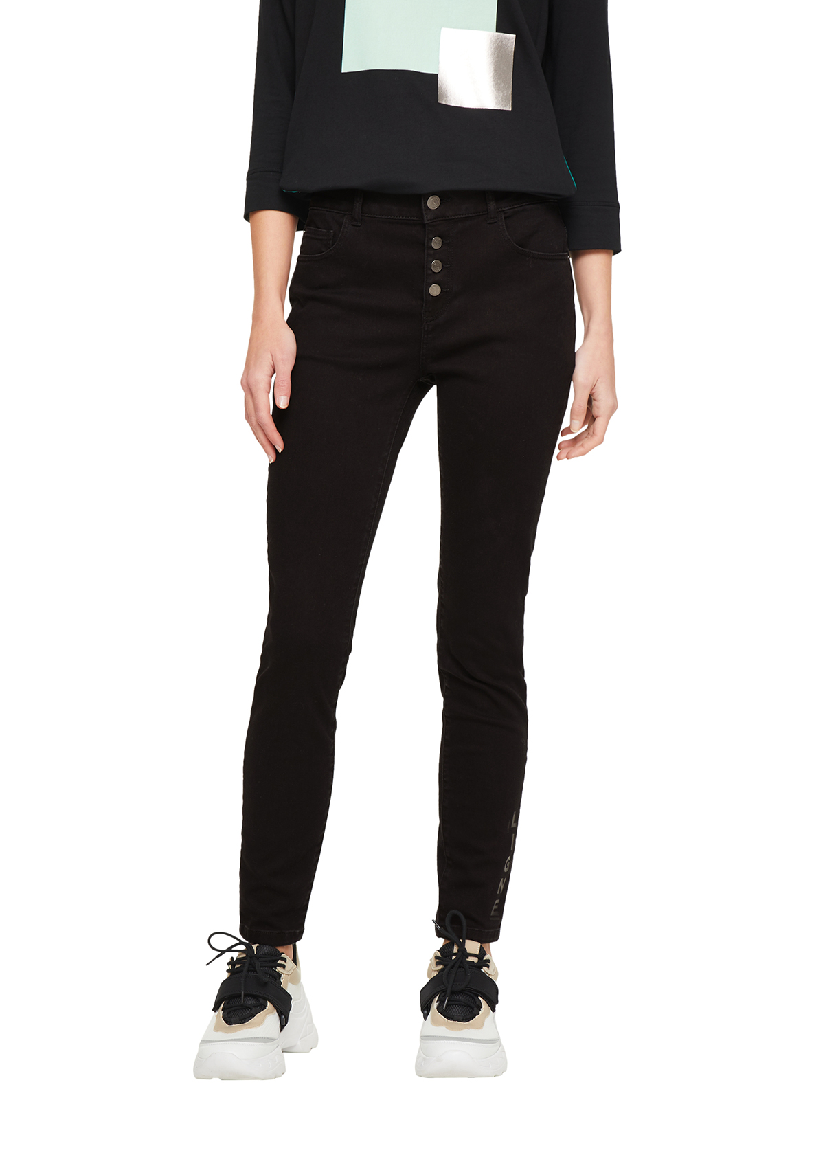 Зауженные джинсы с потертостями и принтом. Высокая посадка, пояс со шлевками. Внутренние передние и задние накладные карманы. Застежка на скрытую молнию и пуговицу.