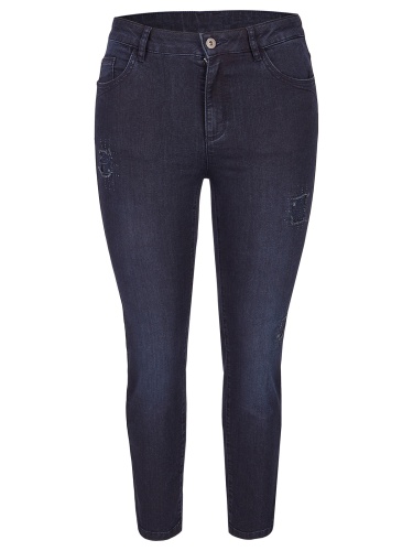Зауженные джинсы с декоративными потертостями и заплатками. Силуэт slim, высокая посадка. Притачной пояс со шлевками, пять карманов, застежка на пуговицу и скрытую молнию.