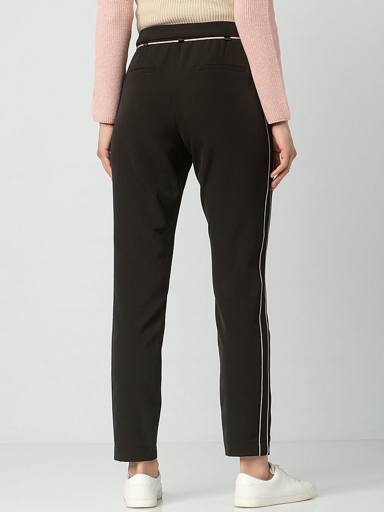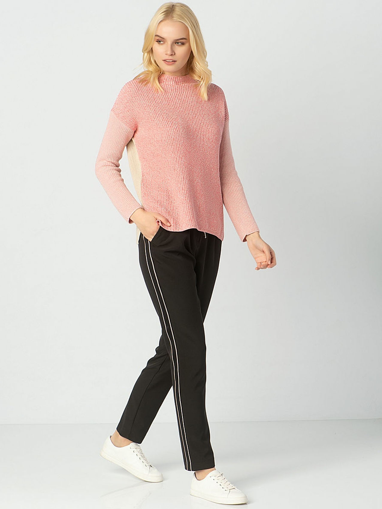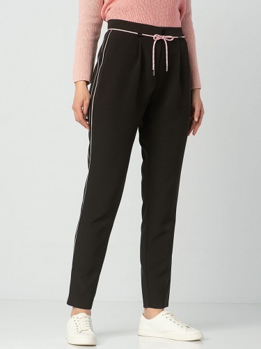 Трикотажные брюки с защипами. Средняя посадка. Декоративные ленты по бокам, декоративный шнурок на поясе. Удобные брюки в спортивном стиле создают демократичный образ.