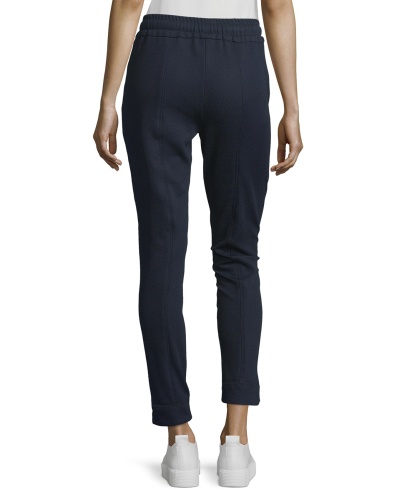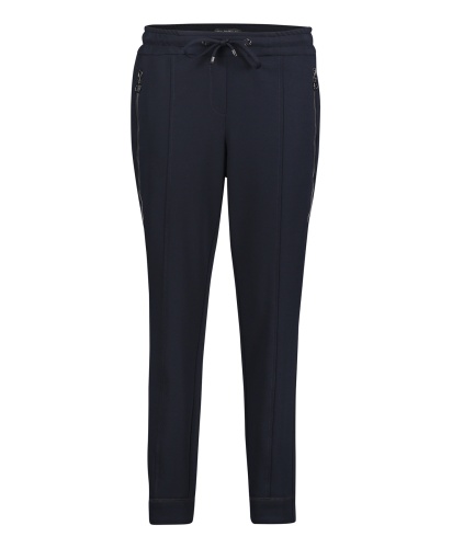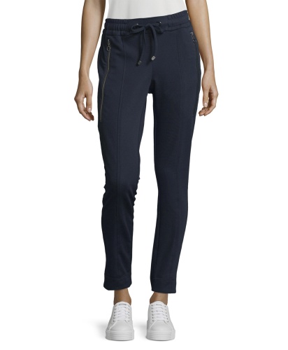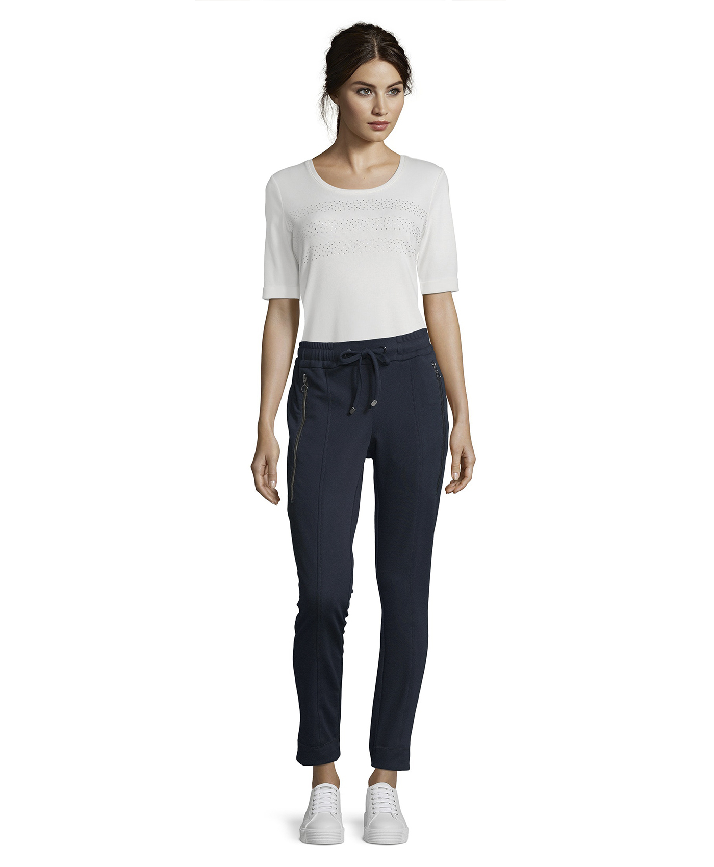 Угнаться за модой? Легко! Спортивные брюки помогут в этом. Удобная средняя посадка, силуэт slim подчеркивает стройные ноги. Эластичный пояс с кулиской. Стильная деталь дизайна - декоративные застежки-молнии по бокам. Эти брюки - отличный выбор для прогулок и занятий спортом.