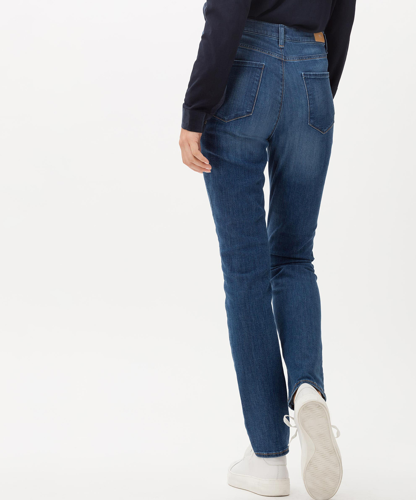 Однотонные джинсы силуэта слим с декоративными затертостями. Высокая посадка обеспечивает комфортное ношение. Пояс со шлевками, застежка на пуговицу и скрытую молнию. Врезные карманы спереди и два накладных кармана сзади. Данная модель джинсов – незаменимая база в современном гардеробе женщины.