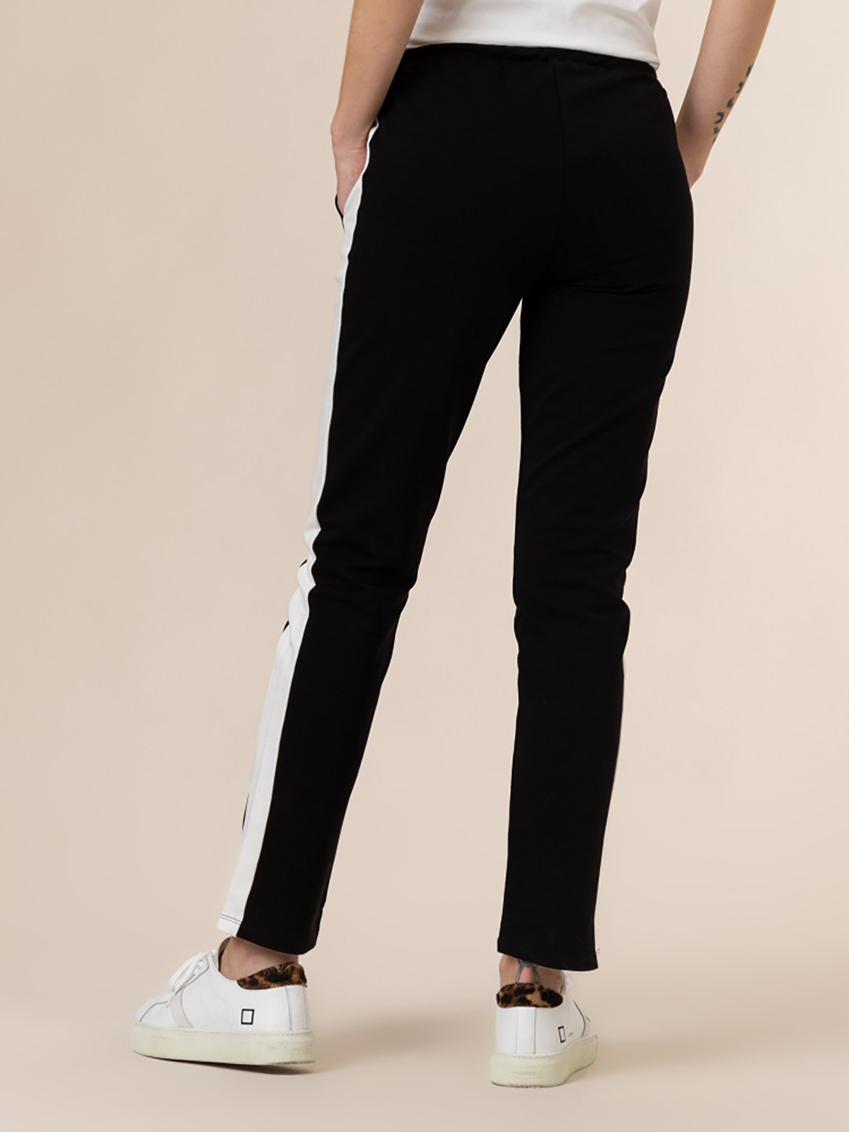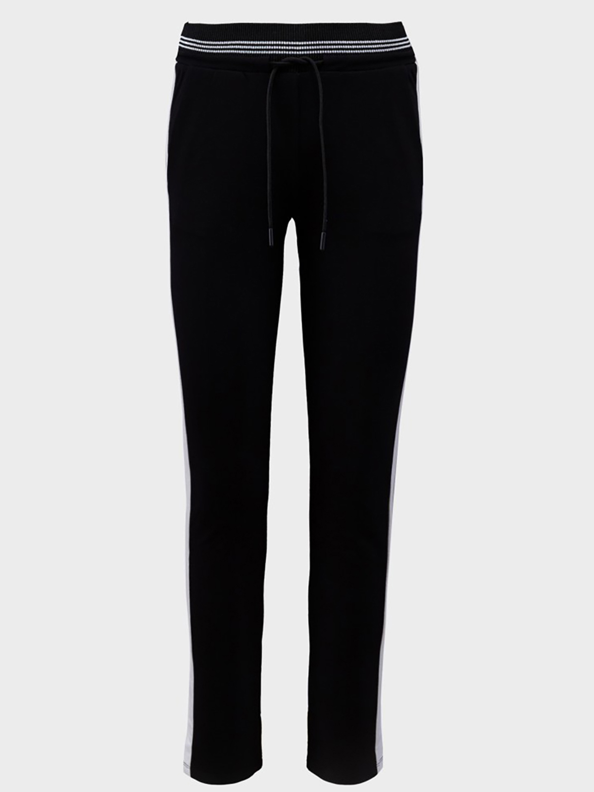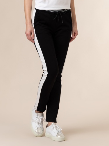 Брюки спортивного стиля с широкими лампасами. Эластичный пояс с кулиской обеспечивает комфортную посадку и удобство ношения.