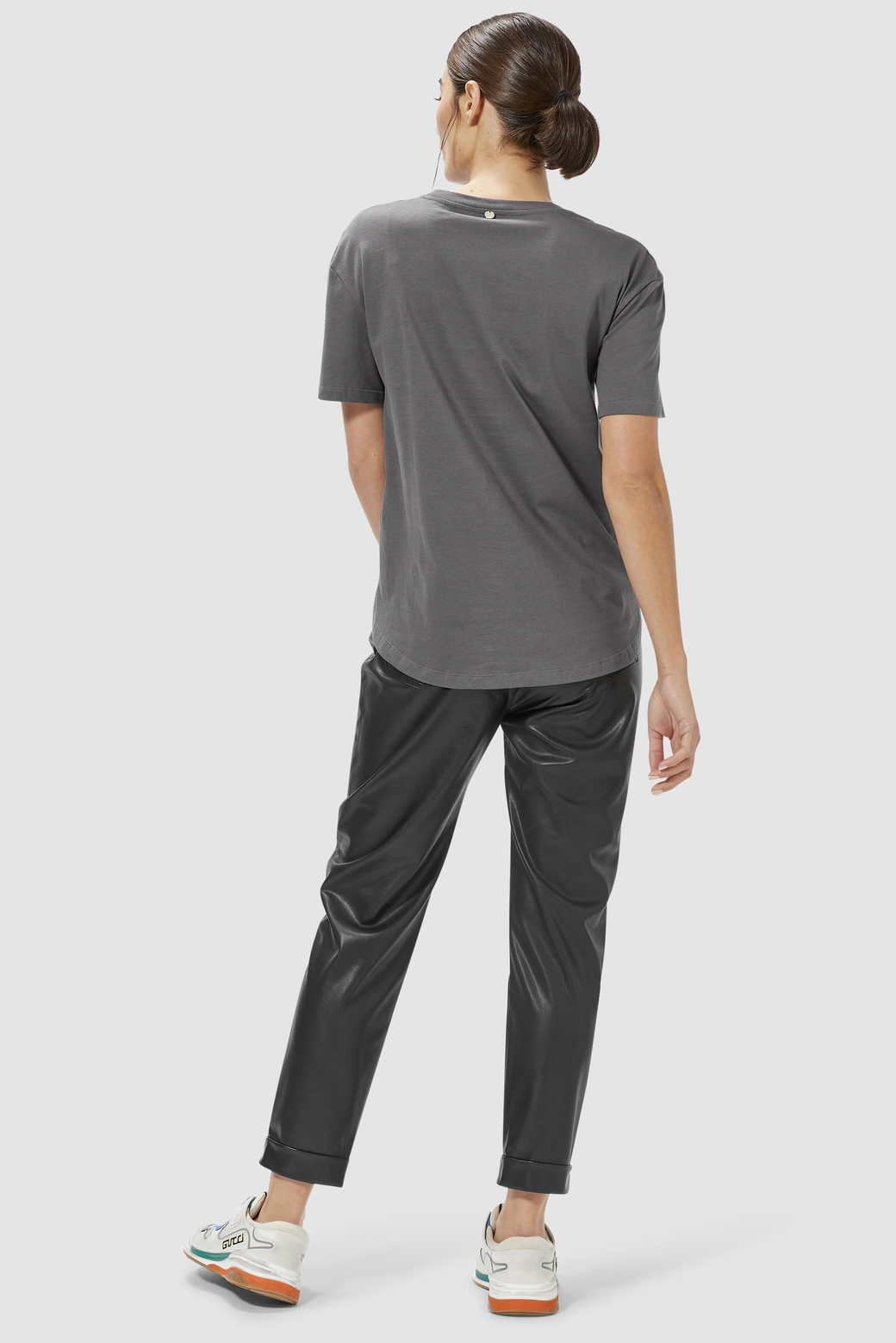 Укороченные брюки из экокожи свободного кроя. Дизайн включает удобные боковые карманы, практичные шлевки для ремня и застежку-молнию. Носите с женственными блузками и лодочками, чтобы создать шикарный деловой образ или с белыми кроссовками и футболкой для городского кэжуал стиля.