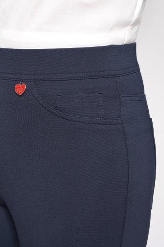 Синие брюки прямого кроя – элегантный и комфортный вариант низа, идеально подходит для делового стиля. Эластичный пояс обеспечивает удобство носки и комфортную посадку. Состав из вискозной смеси гарантирует долговечность изделия. Передние прорезные и накладные задние карманы. Милый акцент в виде металлического лейбла-сердечка.